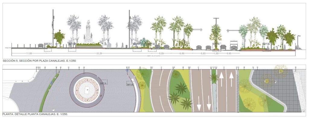 Por otro lado, para las nuevas plantaciones de arbolado que se están realizando en todas estas actuaciones, se ha dispuesto por primera vez en la ciudad de un sistema de plantación con celdas estructurales de polipropileno, destinada al perfecto enraizamiento de los sistemas radiculares de la nueva plantación, que permiten ser rellenadas con sustrato vegetal enriquecido, sistemas de aireación radicular y de anclaje. Todo ello con un sistema de drenaje longitudinal en jardineras y aireación en alcorques para facilitar los aportes hídricos y de oxigenación de las raíces.