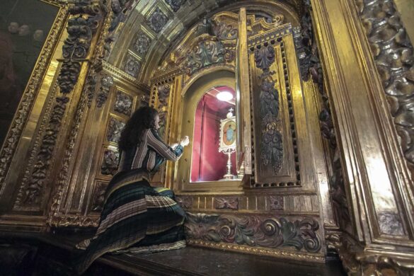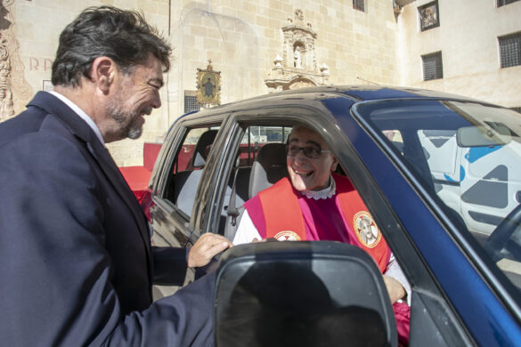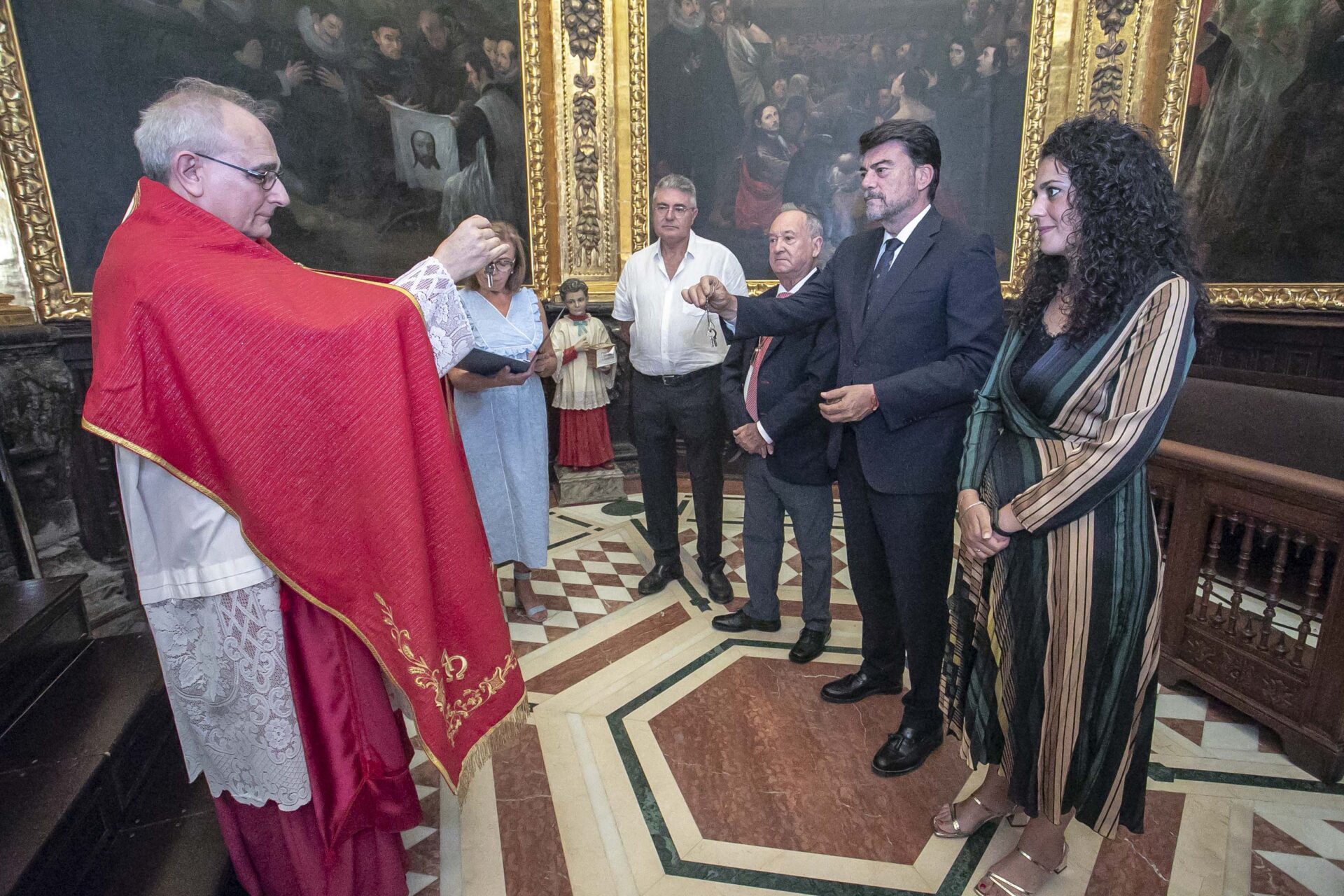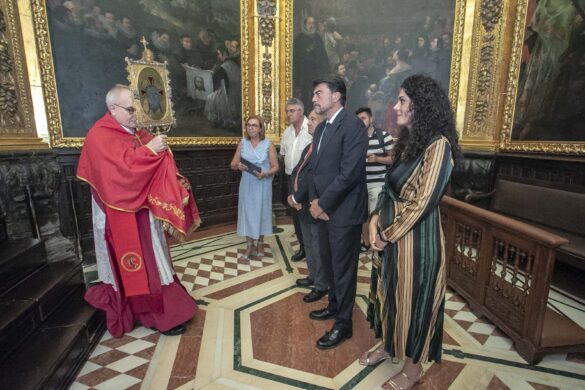 La Reliquia de la Santa Faz ha llegado este viernes a la Concatedral de San Nicolás de Bari para procesionar este sábado junto a la Patrona de Alicante, la Virgen del Remedio, en el 25 Aniversario de su Coronación Pontificia, que coincide también con los 375 años del conocido como ‘Milagro de la Peste’. Luis Barcala, alcalde de Alicante, ha acompañado a la concejala de Fiestas y Síndica, Cristina Cutanda, en el protocolario acto de apertura del habitáculo del camarín del monasterio, donde se venera la Santa Faz.