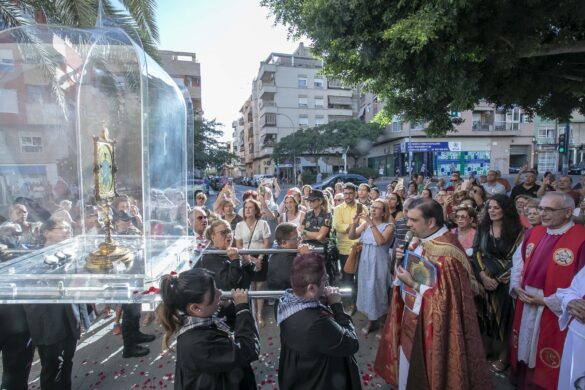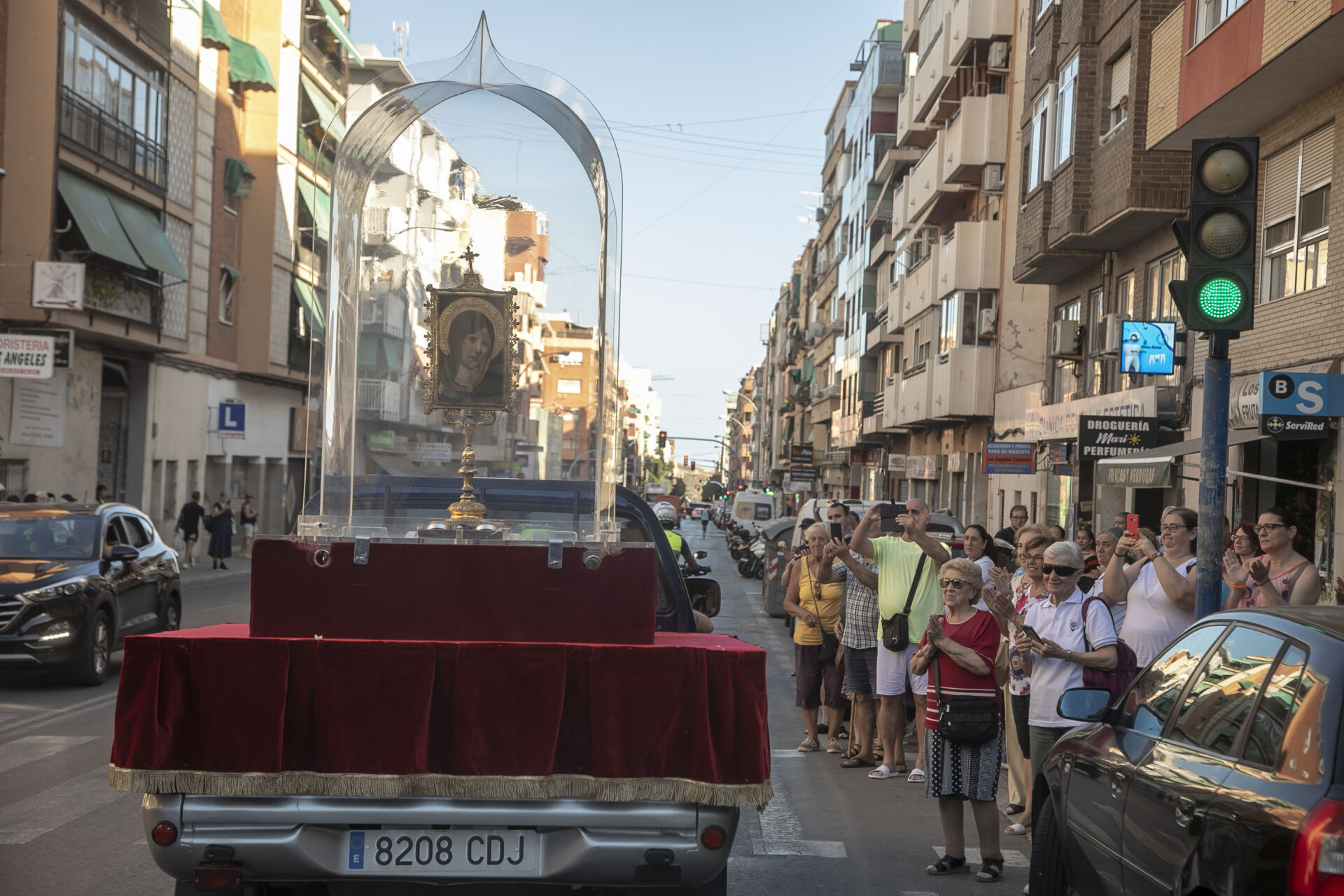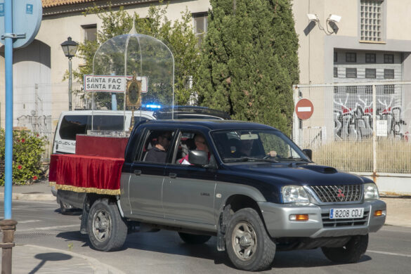 Miguel Ángel Cremades, capellán del monasterio; y los Caballeros Custodios, Eleuterio Llorca y José Espadero, quien ya desempeñara este cometido en 1988 coincidiendo con la Coronación Pontificia de la Virgen del Remedio, también han estado presente en el momento en el que la Santa Faz ha abandonado el caserío para dirigirse hacia la parroquia de Nuestra Señora de los Ángeles. Lo ha hecho en el denominado ‘faz-móvil’, escoltado por agentes de la Policía Local. La comitiva ha sido recibida en el barrio de Los Ángeles con el disparo de una traca antes de que la Santa Faz entrara en el templo. Allí se ha desarrollado una breve ceremonia religiosa, antes de partir hacia el barrio de San Antón. El paso de la Santa Faz por las calles ha sido saludado por ciudadanos situados en las aceras.
