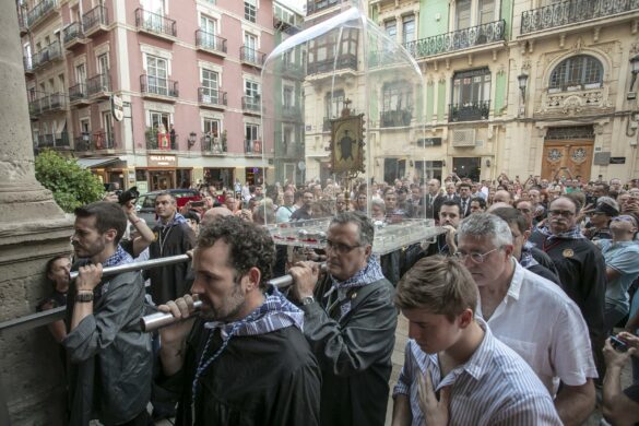 El deán de San Nicolás, Ramón Egío, y el párroco de Nuestra Señora de la Misericordia, Felipe Martínez, han recibido al Sagrado Lienzo a las puertas de este tempo, donde se ha congregado un buen número de fieles. Después de unas oraciones en honor a la Santa Faz, la imagen ha partido hacia la Concatedral sobre los hombros de distintos grupos de cargadores. El acompañamiento musical lo ha puesto la Banda Sinfónica Municipal, dirigida por Pedro Lara, que ha interpretado ‘La Pilarica’ (J. Teixidor), ‘Cordero de Dios’ (R. Dorado) y ‘Salve Virgen del Remedio’ (B. Sanchís). Según se ha acercado la comitiva a San Nicolás se han ido sumando más personas al cortejo. Esta sensación se ha visto acrecentada al paso por la calle Labradores.
