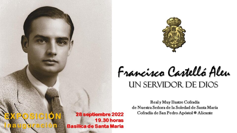 Coincidiendo con la festividad del beato alicantino Francisco Castelló Aleu y la apertura oficial de los actos conmemorativos con ocasión del 25 aniversario fundacional de San Pedro Apóstol, la Real y Muy Ilustre Cofradía de Nuestra Señora de la Soledad de Santa María y la Cofradía de San Pedro Apóstol, con sede canónica en la Basílica de Santa María de Alicante, en el mismo templo en que el preclaro mártir fue bautizado el 1 de mayo de 1914, inaugurarán el próximo 28 de septiembre la exposición “Francisco Castelló Aleu. Un servidor de Dios” en honor del beato elevado a los altares en 2001 por el Papa San Juan Pablo II.
