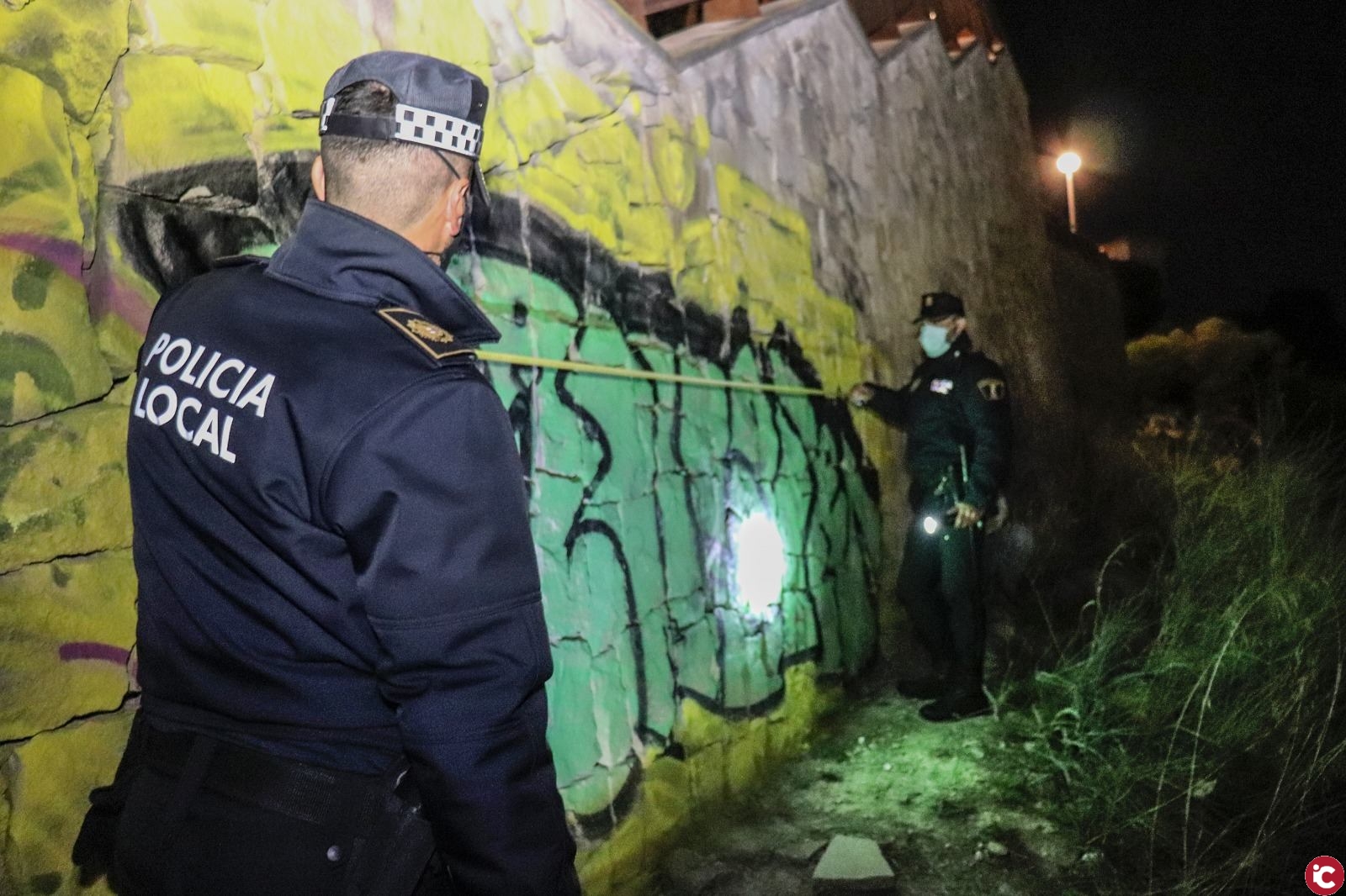 Según fuentes policiales los hechos ocurrieron la pasada tarde del sábado sobre las 19,10 horas, cuando una patrulla de los Fox, se encontraba realizando vigilancia en el plan anitibotellón frente al Covid, y observaron a cuatro personas realizando una pintada de grandes dimensiones en la parte lateral que da acceso a la fortaleza del Castillo de San Fernando, en Camino de Ronda.