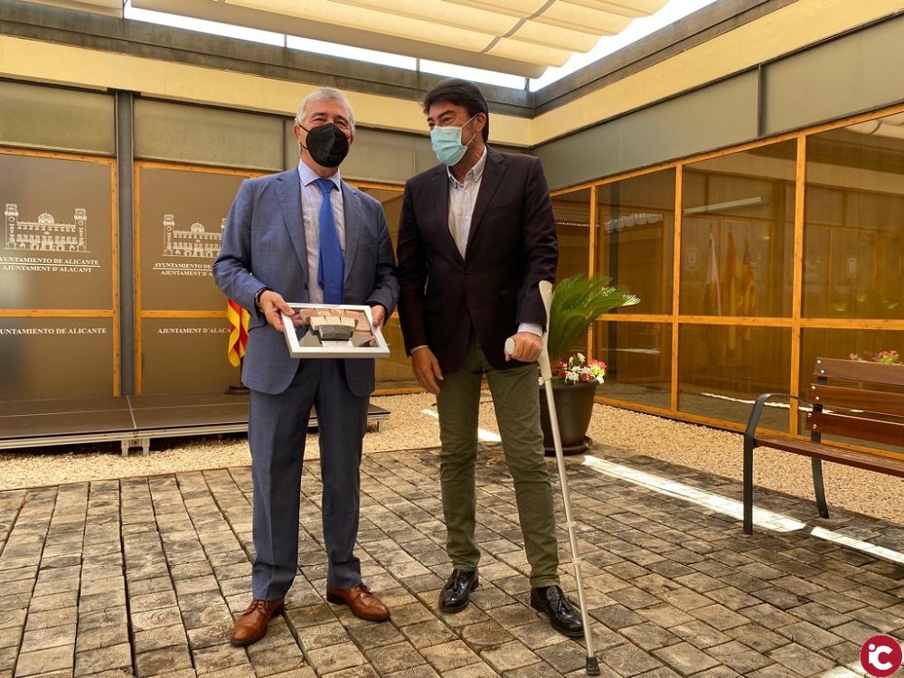 El alcalde de Alicante, Luis Barcala, ha entregado este mediodía un cuadro con las “emblemáticas”, como las ha definido, Teselas de la Explanada a Juan Cabello, director de El Corte Inglés Alicante, quien se jubila a partir del 31 de agosto. “Ésta es, ha explicado el primer edil, una muestra de agradecimiento hacia una persona que se ha ganado el cariño y el aprecio de las personas que lo conocemos, tanto en su faceta personal como profesional”. Cabello, emocionado, ha agradecido el detalle “que supondrá que siempre tenga presente a Alicante, y que ocupará un lugar destacado en mi Rincón de Recuerdos”. El actual director de El Corte Inglés Alicante llegó en 1989, proveniente de Valencia. Será reemplazado, a partir del 1 de septiembre, por Alfredo Carvajal, quien llega a Alicante desde Cartagena.