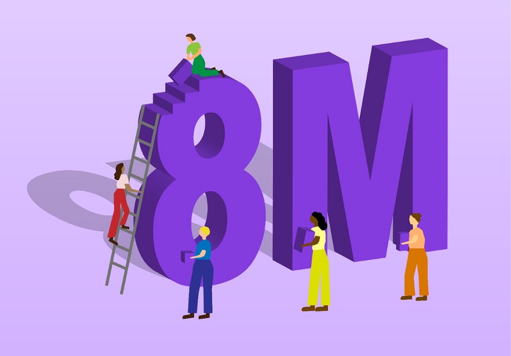 Su autora es Lidia Mena, que ha enviado su obra desde Andalucía. En ella se puede ver a varias mujeres que llevan pequeños bloques para completar el número 8 del 8M que se representa en obras. Utiliza el color violeta para el acrónimo del Día Internacional de las Mujeres y para el fondo del cartel. Y con esta idea plasma la unidad y colaboración para conseguir la igualdad efectiva entre hombres y mujeres.