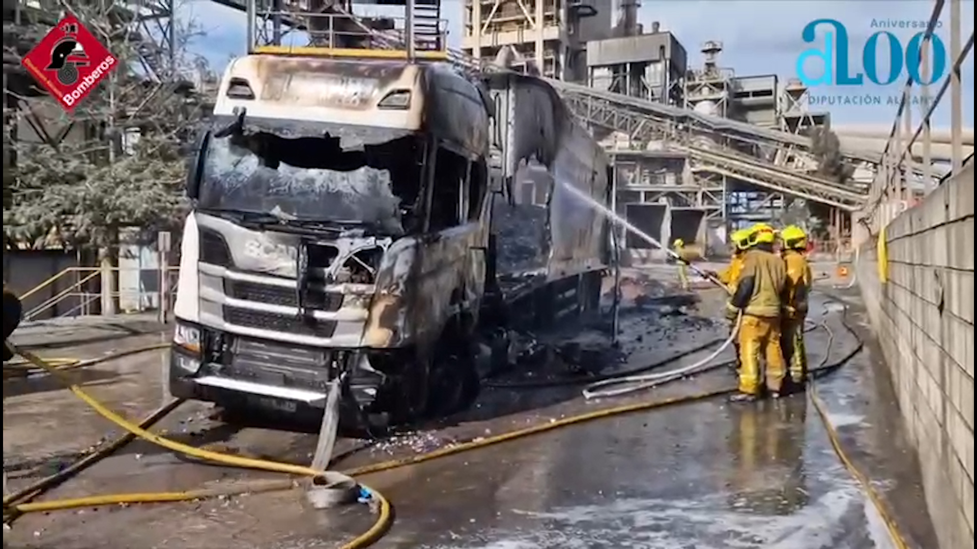 A su llegada, encontraron un camión en llamas dentro del recinto de la cementera cuyo peligro mayor era que estaba perdiendo combustible
