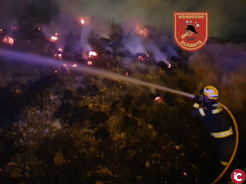 Alicante, 6 de octubre de 2020. La Concejalía de Seguridad del Ayuntamiento informa que esta madrugada se ha originado un incendio en la avenida de Novelda, en una zona anexa a la autopista AP-7, y la rápida intervención de los bomberos del Servicio de Prevención, Extinción de Incendios y Salvamento de Alicante -SPEIS-, evitaron su propagación y un incendio de mayores dimensiones, afectando a quinientos metros de matorral.