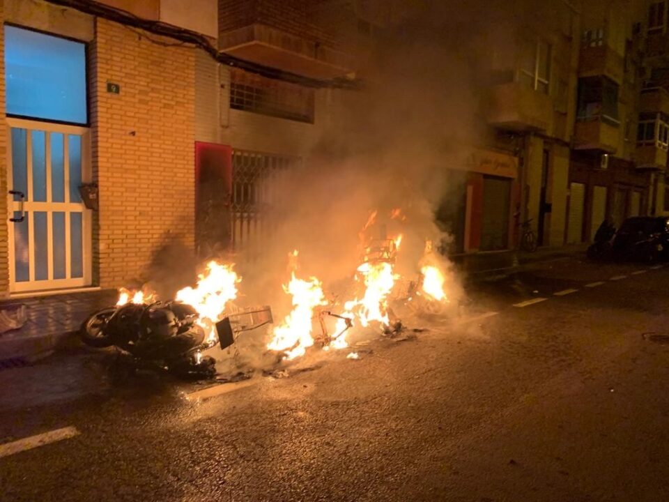 La Concejalía de Seguridad del Ayuntamiento de Alicante informa que esta madrugada se ha organizado un amplio operativo de Policía Local y Bomberos del Servicio de Prevención, Extinción de Incendios y Salvamento (SPEIS) para controlar y extinguir un incendio originado en varias motocicletas y ciclomotores que se encontraban aparcadas en la calle Virgen de Montserrate. La Policía Local informó que en el incendio resultaron calcinados tres ciclomotores y dos motocicletas, y afectados dos vehículos, así como la fachada del edificio. Los cuerpos de Seguridad del Ayuntamiento fueron alertados a través del 112, sobre las 05.30 horas, de la existencia de un incendio de varias motocicletas, de inmediato se desplazaron tres unidades del Servicio Nocturno de Policía Local hasta el lugar de los hechos y una dotaciones de bomberos. Los primeros en llegar al incendio fueron los agentes de Policía Local de Alicante que comprobaron una enorme columna de fuego y humo, y un aparatoso incendio que devoraba un grupo de motos estacionadas unas junto a otras, frente al inmueble número 9 de la calle Virgen de Montserrate, y junto a ellas se encontraban varios turismos aparcados, con gran riesgo de que el fuego se propagarse hacia los coches, dado su proximidad. Según fuentes policiales las llamas y gran carga térmica generada por la combustión de las motos, afectó al sistema de los timbres del portal del inmueble, y para evitar que el fuego afectara a los vehículos, los Policías Locales en coordinación con la central de radio, proporcionaron los datos de las matrículas de los turismos con riesgo de incendio. La Policía Local desde central buscó a los titulares en las bases de datos y lograron contactar telefónicamente con los mismos, quienes una vez informados de la situación, arrojaron por la ventana las llaves de los vehículos próximos, que fueron retirados por los agentes, evitando su incendio. Los agentes han retirado del lugar dos turismos próximos y un ciclomotor evitando así su calcinación. De forma paralela una dotación de bomberos de la ciudad inició con celeridad la extinción del incendio logrando controlar el fuego, y desplegando varias líneas de agua. La intervención duró más de media hora, y se consiguió su extinción, el fuego se inició por causas que se desconocen. En el incendio quedaron calcinadas tres ciclomotores y dos motocicletas, así como afectada la fachada de dos inmuebles del edificio y fundida la instalación de los timbres del edificio. Así como otros dos turismos que se encontraban estacionados enfrente de las motos también, que también resultaron parcialmente afectados y sufrieron daños en las partes plásticas como consecuencia del calor desprendido por el fuego. |