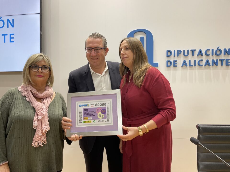 Estela Medina, directora de la ONCE en Alicante; Loreto Serrano, diputada de Bienestar Social e Igualdad y Antonio Pérez, presidente de Diputación de Alicante, han presentado este cupón que coincide con la celebración del Día Internacional de la Eliminación de la Violencia contra la Mujer, que se conmemora cada 25 de noviembre para denunciar la violencia que sufren las mujeres en todo el mundo y reclamar políticas en todos los países para su detección y eliminación, una cuestión de derechos humanos.