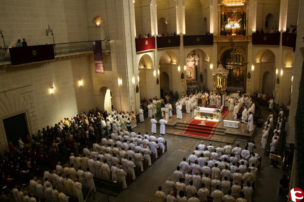 Esta mañana se ha celebrado en la Concatedral de San Nicolás de Alicante la Misa Crismal, una ceremonia presidida por el Obispo Diocesano, Monseñor Rafael Palmero. En ella se reúnen cada Lunes Santo por la mañana todos los sacerdotes de la Diócesis de Orihuela-Alicante para renovar sus promesas sacerdotales. También se han dado cita los diáconos y los seminaristas así como gran cantidad de laicos que han dotado de gran tradición y participación a esta celebración religiosa. Este año han asistido además un centenar de escolares del Colegio Festivo de Novelda.