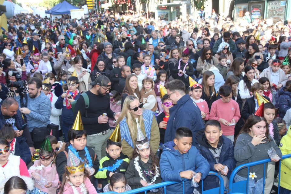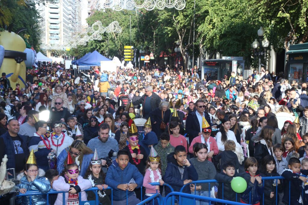 Más de 3.000 personas han despedido este mediodía el año 2024 en la ya tradicional Nochevieja Infantil que, por segundo año consecutivo, se ha celebrado en la Rambla de Méndez Núñez, a la altura del Portal de Elche. El reparto de las uvas de la suerte -en este caso bolsitas de golosinas blandas sin glúten- y de 1.800 cotillones, un espectáculo de ilusionismo o la posibilidad de fotografiarse junto a hinchables representando a los personajes más populares de la animación infantil, han prologado el anuncio del nuevo año con el sonido de las campanadas a través de la megafonía instalada en el perímetro. No han querido perderse la celebración la concejala de Fiestas, Cristina Cutanda, el vicealcalde, Manuel Villar, y otros integrantes de la Corporación municipal.