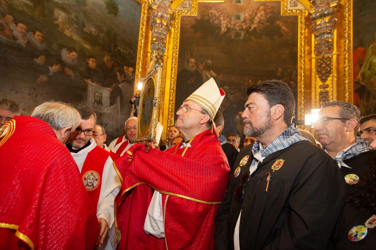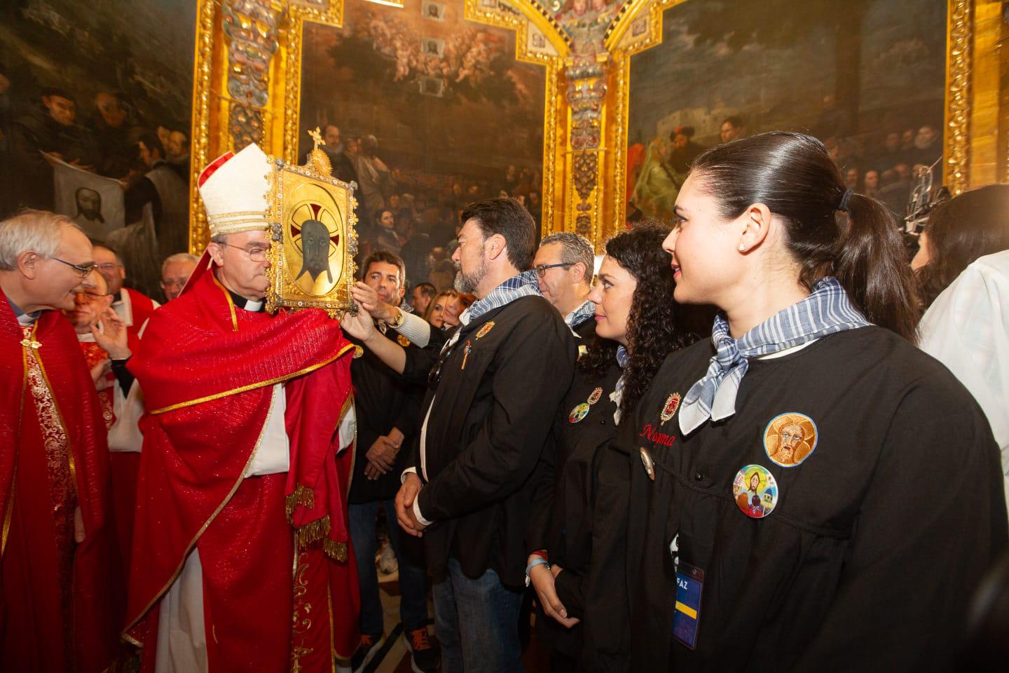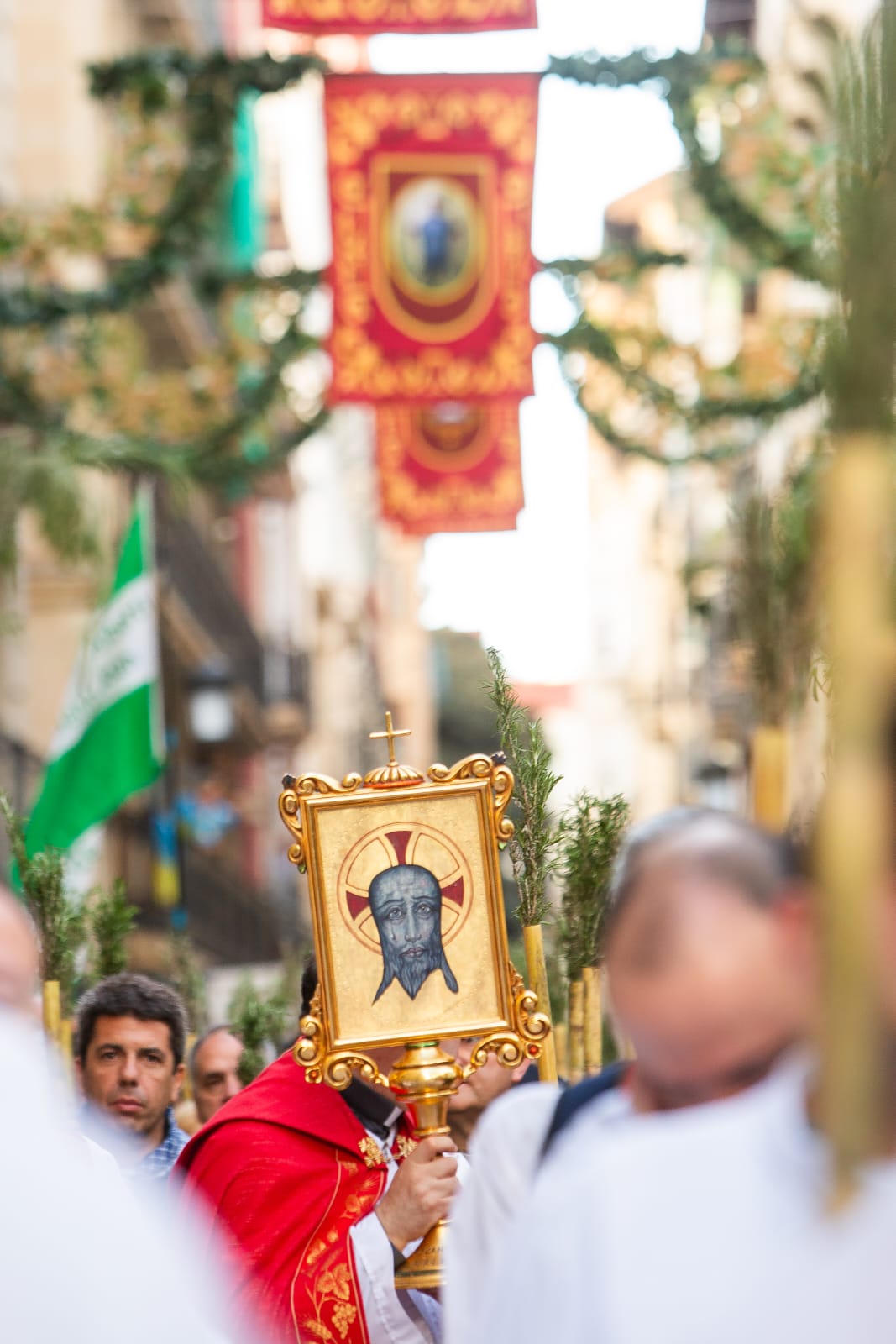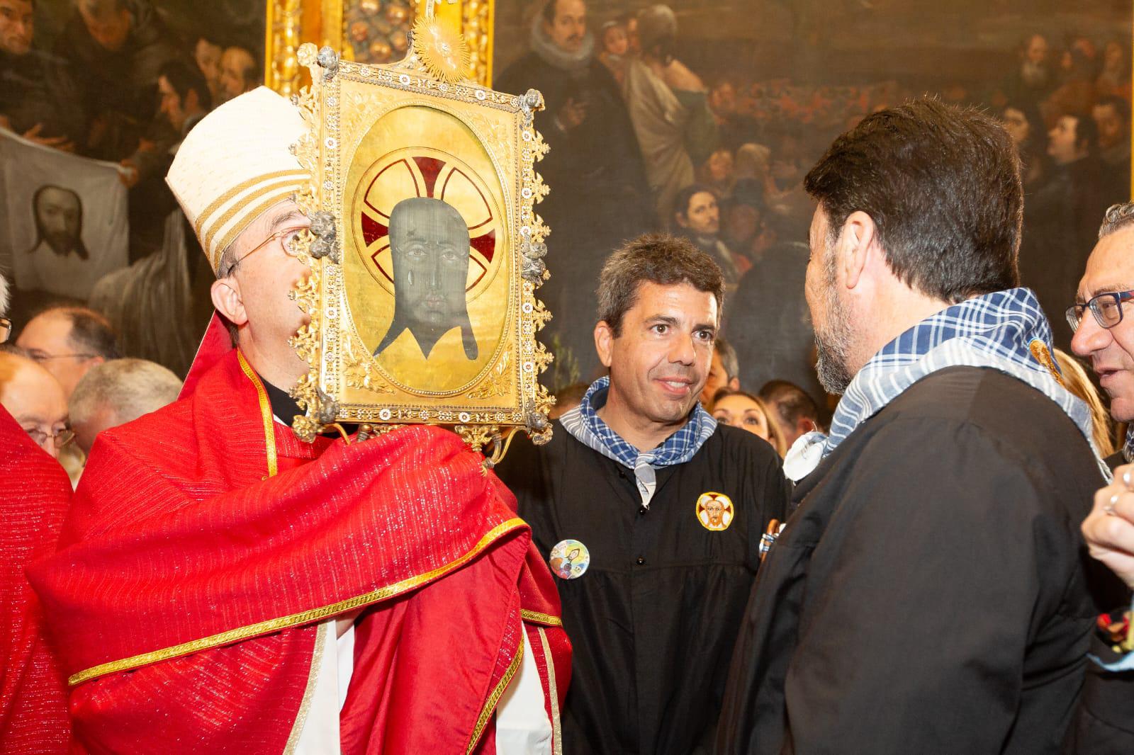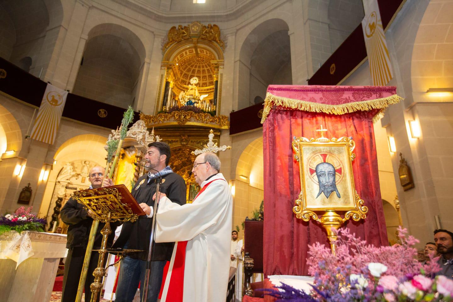 Siguiendo el ritual tradicional, bajo palio, la Santa Faz ha sido portada por el obispo Munilla hasta la plaza de Luis Foglietti para la celebración de la Eucaristía. Al término, y siguiendo el mismo ceremonial, el Sagrado Lienzo ha sido devuelto al camarín. A la conclusión, Barcala, Mazón y Toni Pérez han hecho un donativo a las Monjitas de la Sangre, quienes se encargan de custodiar a la Santa Faz durante todo el año.