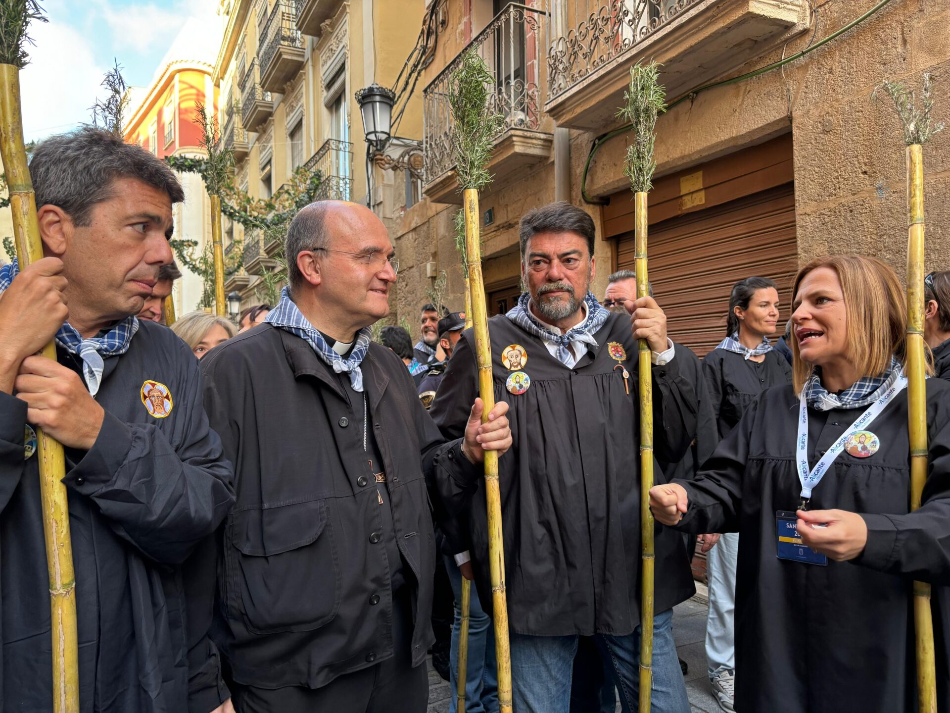 La Peregrina ha arrancado pasadas las ocho de la mañana desde la Concatedral de San Nicolás, después del reparto de 15.000 cañas de romero entre la fachada principal del Ayuntamiento y la concatedral. El primer edil y los integrantes de la Corporación Municipal ha hecho la romería junto al presidente de la Generalitat, Carlos Mazón, y el presidente de la Diputación Provincial, Toni Pérez, quienes han acompañado al obispo de Orihuela-Alicante, José Ignacio Munilla, en la 535 Romería a la Santa Faz, coincidiendo con el Año Jubilar.