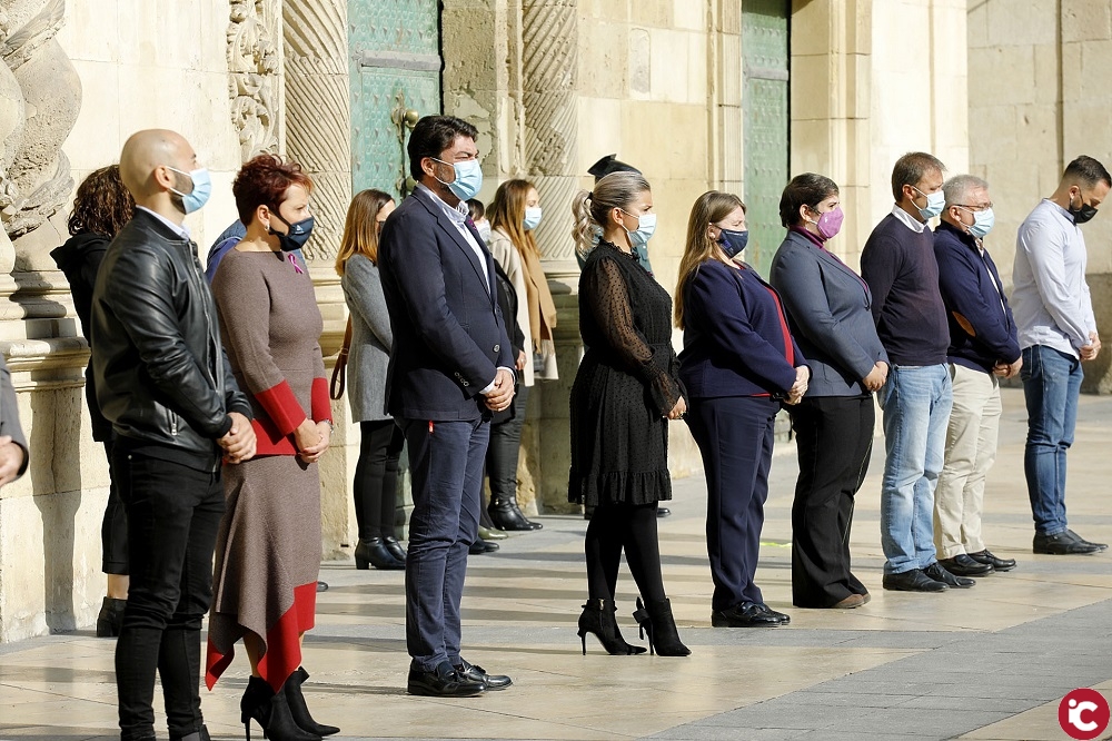 Alicante, 25 de noviembre de 2020. El alcalde de Alicante, Luis Barcala, junto la vicealcadesa de Alicante, Mari Carmen Sánchez, la Concejala de Igualdad, María Conejero, y miembros de la corporación municipal, han desplegado hoy en el balcón del Ayuntamiento una pancarta bajo el lema Contra les violencies masclistes, y con posterioridad han guardado un minuto de silencio con motivo del 25N, Día Internacional de las Violencias Machistas.