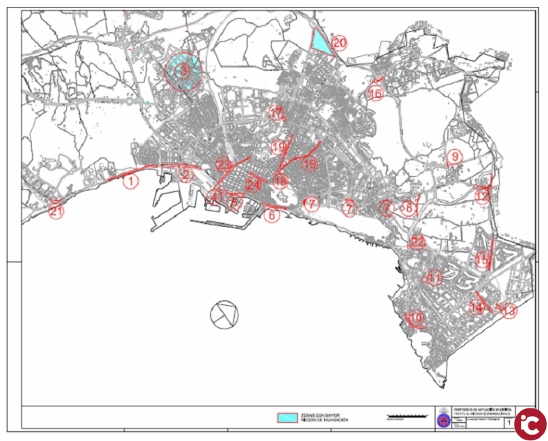 Dentro del Protocolo de actuación municipal frente a inundaciones se establecen 25 puntos o zonas que con motivo de fuertes lluvias y tormentas, podrían ser susceptibles de inundación, entre las que se encuentran, se adjunta plano: