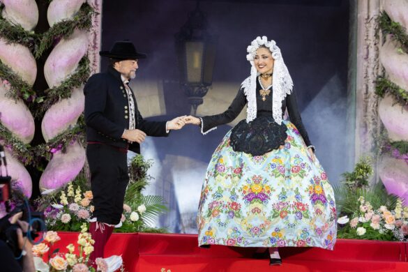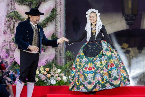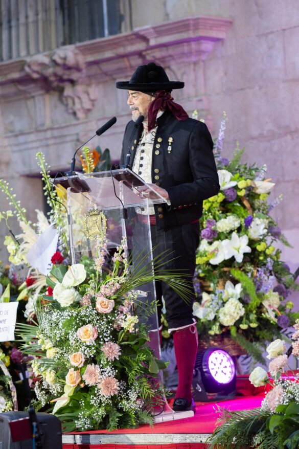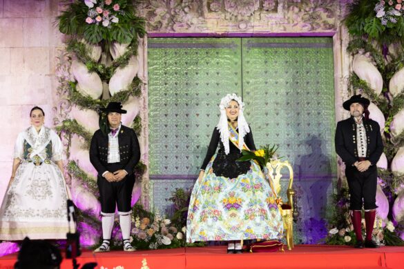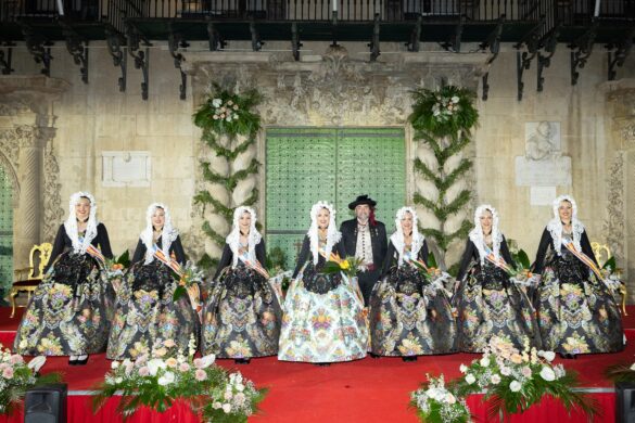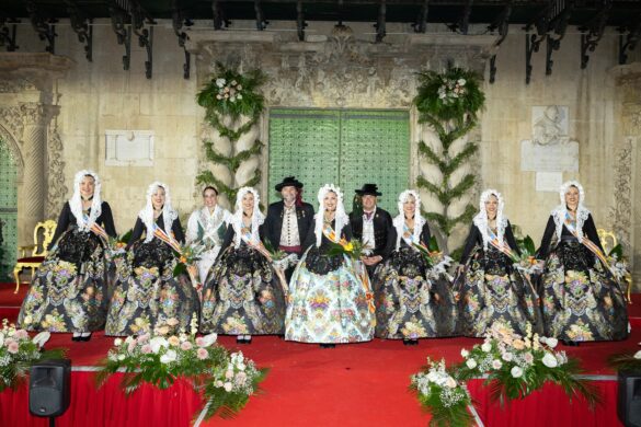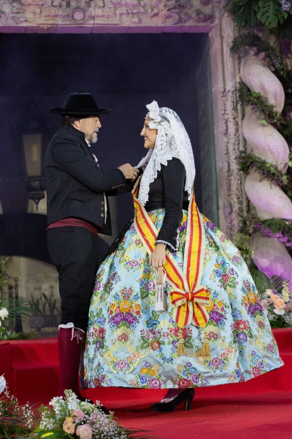 Barcala ha incidido en el espolín azul mar, con sedas de 46 colores en las flores adornado con metales en oro y elaborado por Vives i Marí, que ha lucido la Bellea del Foc. Y ha sido en ese momento cuando ha recordado para ella y sus Damas algunos de los versos del pasodoble ‘Novia alicantina’, original de Moisés Davia, quien fuera director de la Banda Municipal de Música, alusivos al traje de novia alicantina.
