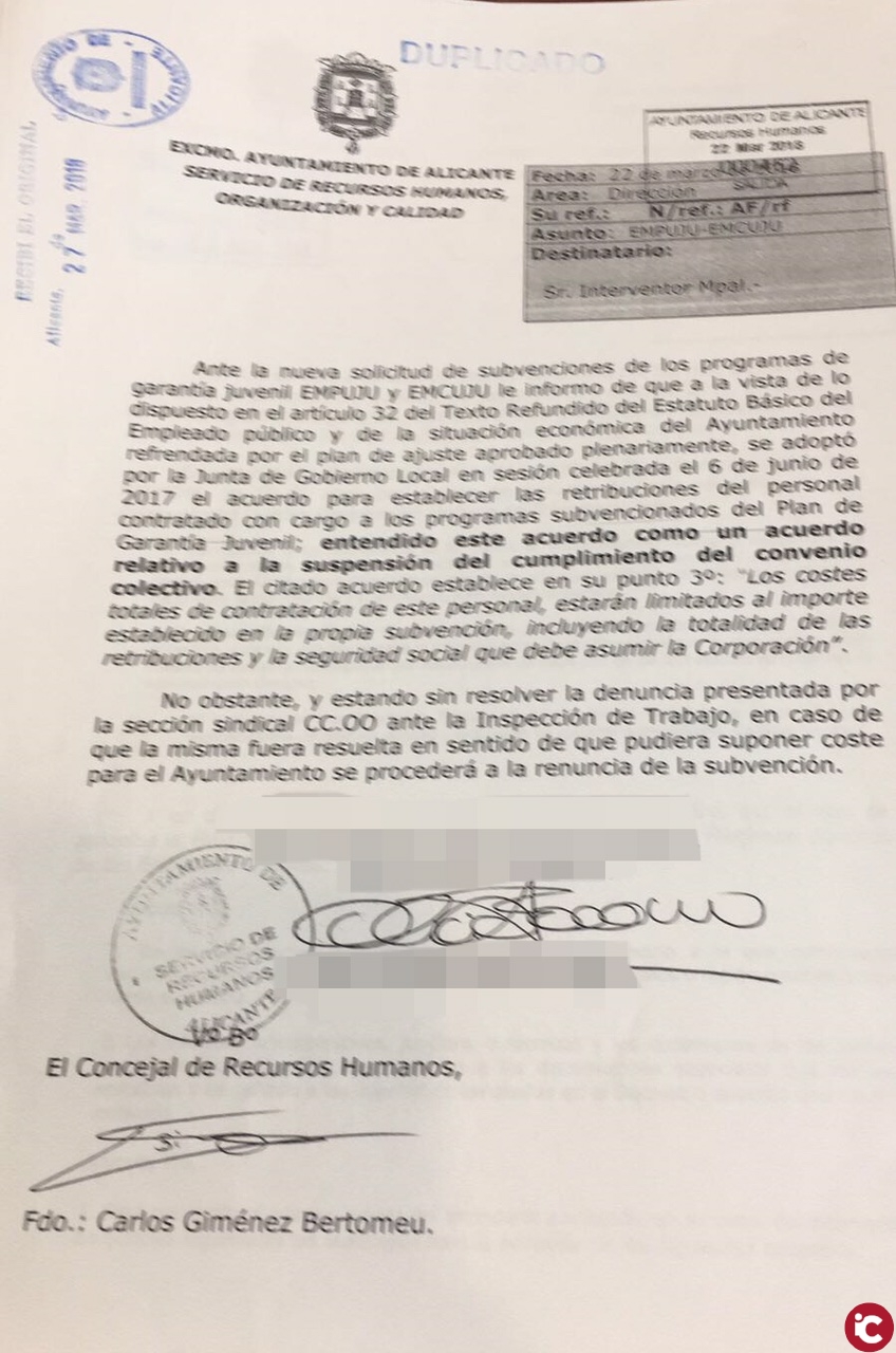 5. Lo mas sorprendente de las críticas del PSOE es que su anterior responsable de Personal, Carlos Giménez, firmó el pasado 22 de marzo un documento en el que formulaba expresa renuncia a la contratación de cualquier joven a través de los programas Emcuju y Empuju si suponía algún tipo de coste para el Ayuntamiento de Alicante, como se puede leer en el último párrafo del escrito firmado con el todavía concejal socialista: No obstante, y estando sin resolver la denuncia presentada por la sección sindical de CC.OO. ante la Inspección de Trabajo, en caso de que la misma fuera resuelta en sentido de que podría suponer coste para el Ayuntamiento de Alicante se procederá a la renuncia de la subvención.