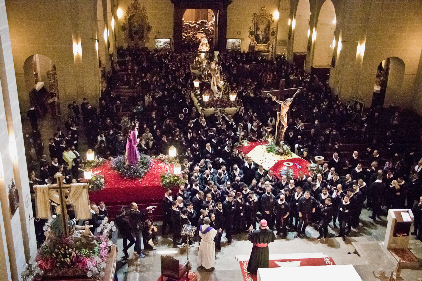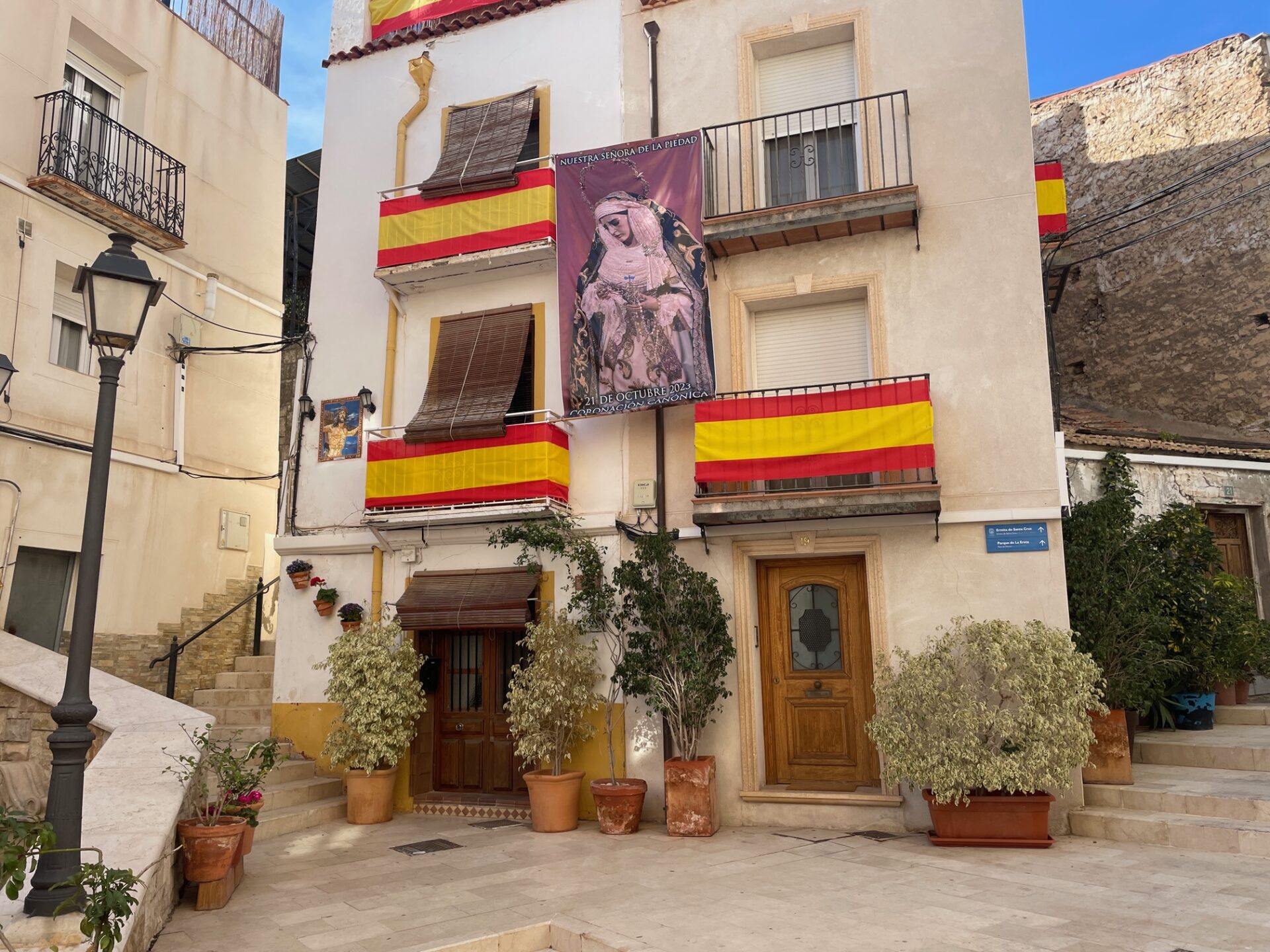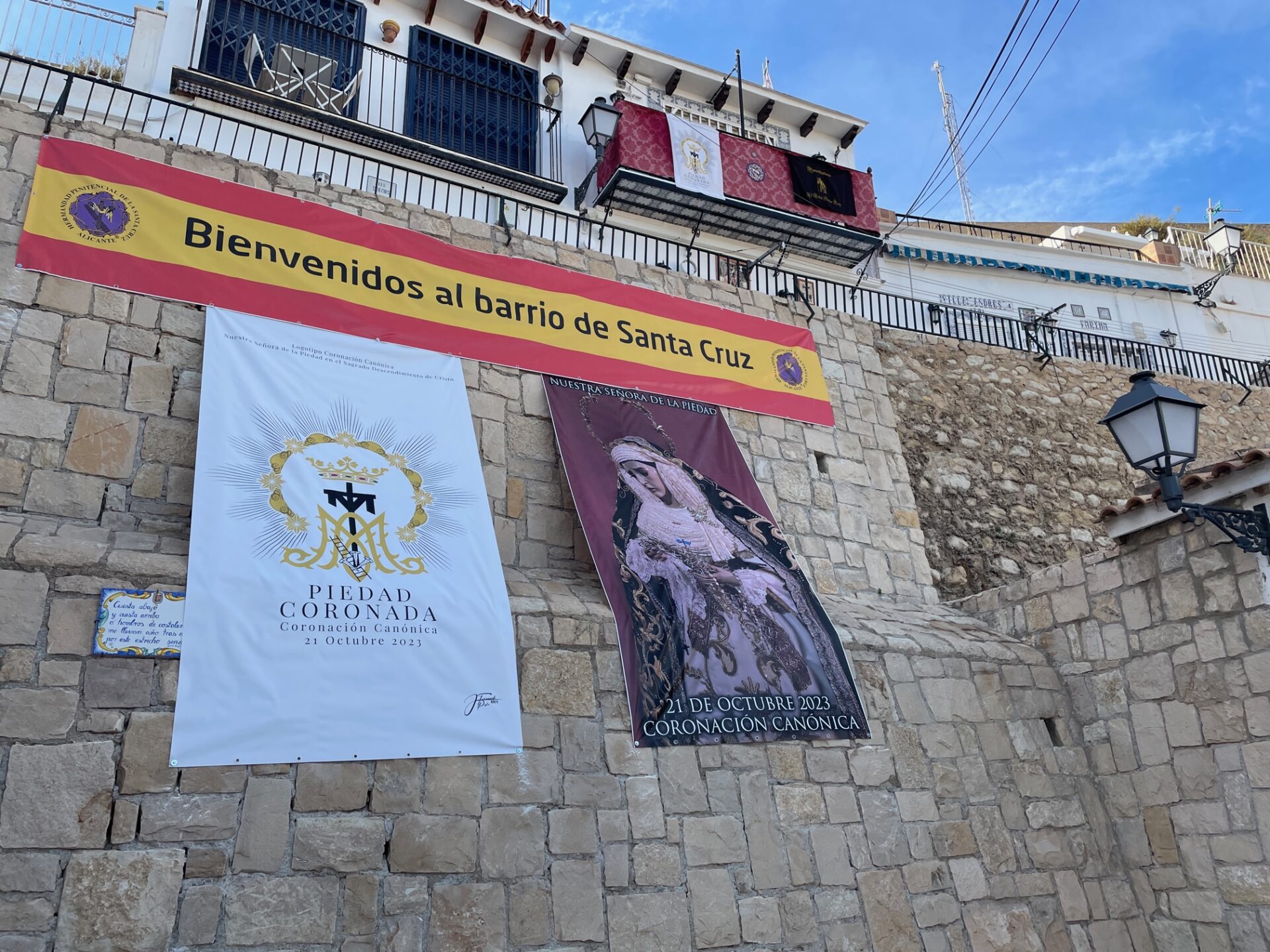 Alicante, 3 de abril de 2023.- La Hermandad de Santa Cruz pondrá banderolas en el Barrio, coincidiendo con la Procesión del Miércoles Santo, para recordar la Coronación de la Virgen de la Piedad del paso del Descendimiento, programada para el sábado 21 de octubre, a partir de las 18 horas, en una ceremonia religiosa que presidirá el obispo de Orihuela-Alicante, José Ignacio Munilla. El pasado sábado, 1 de abril, durante el Acto Institucional del Pregón, que pronunció el presidente de la Diputación, Carlos Mazón, se descubrió el logotipo conmemorativo de la efeméride, original de J. Fernando Palos López. La afamada cantaora Fina de Ángeles interpretará saetas al paso de la comitiva por la sede de la Hermandad, situada en la calle San Rafael.