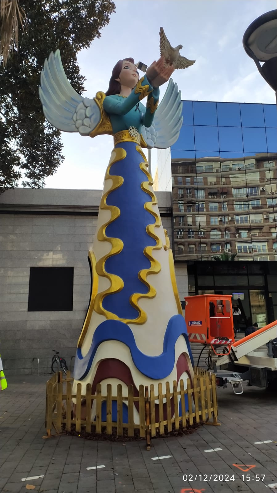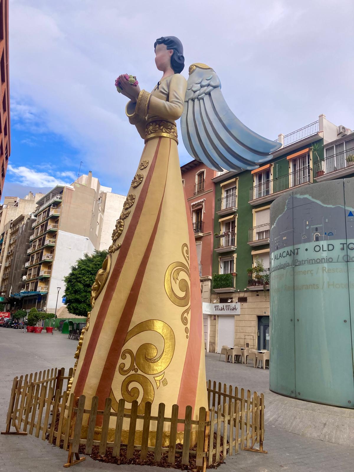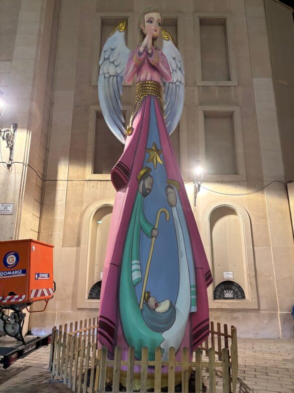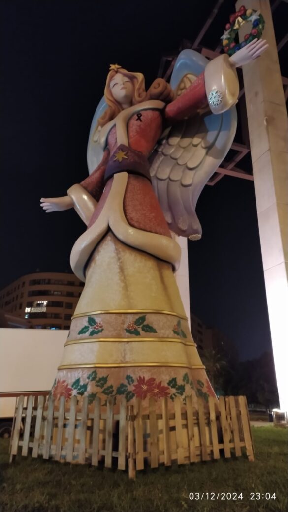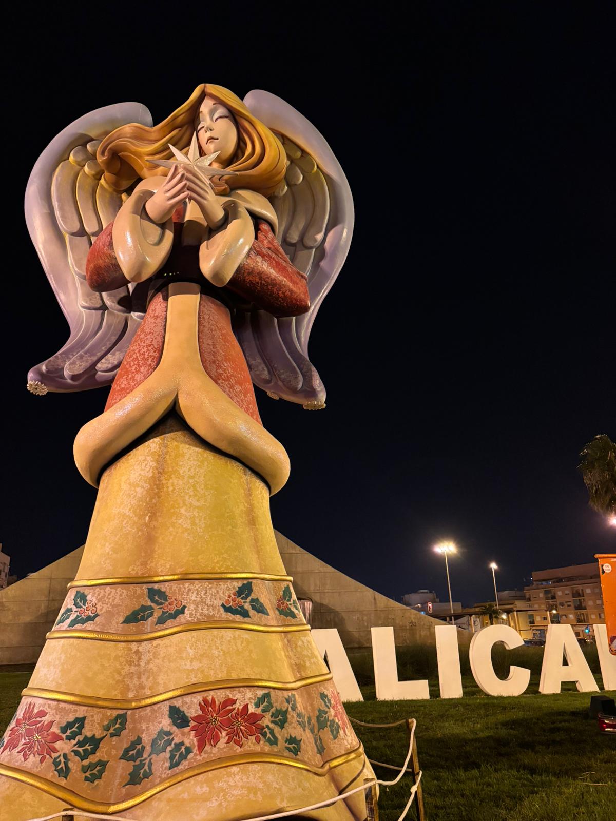 Los seis ángeles alcanzan una altura de nueve metros. Son originales del artista de hogueras, Lorenzo Santana, y están situados en la rotonda de la Universidad de Alicante, plazas de España y San Cristóbal, estación de Adif, paseo central de la avenida del General Marvá y en la avenida Xavier Soler, en la Gran Vía. Éstas dos últimas ubicaciones son novedad en estas navidades. Todas las figuras lucen crespones negros en señal de duelo por las víctimas de la dana.