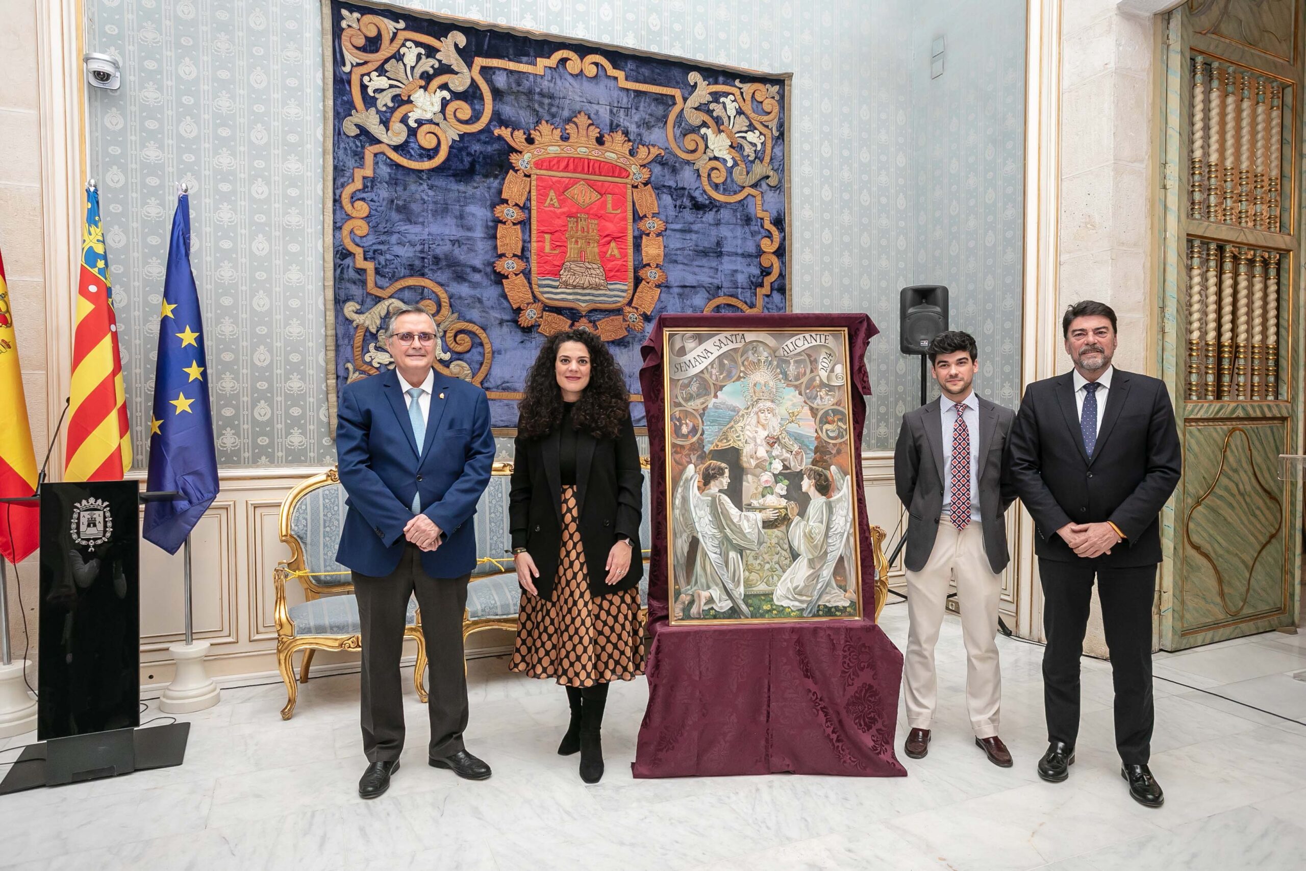 Alicante, 16 de febrero de 2024.- Una composición alegórica de la Virgen de los Dolores Coronada, como ha explicado el autor, Pedro Castro, anuncia la Semana Santa de Alicante 2024. La obra ha sido presentada este viernes en el Salón Azul del Ayuntamiento de Alicante con la presencia del alcalde, Luis Barcala; el vicealcalde, Manuel Villar; la concejal de Fiestas, Cristina Cutanda; el presidente de la Junta Mayor de Hermandades y Cofradías, Alfredo Llopis, e integrantes de la Corporación Municipal.