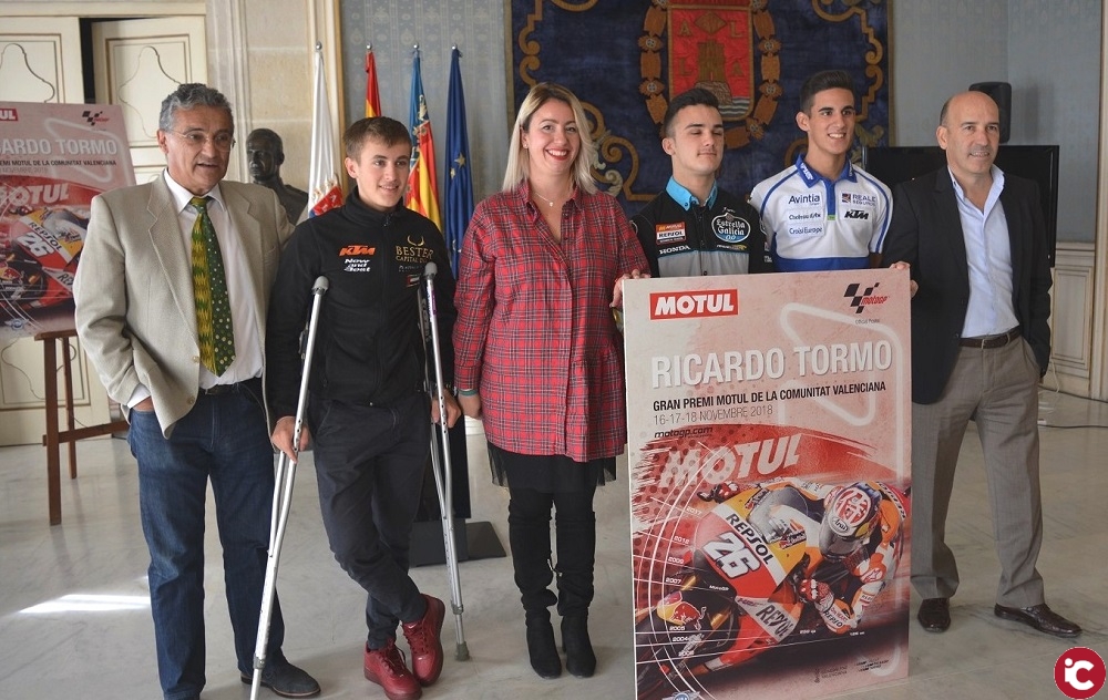 El Salón Azul del Ayuntamiento ha acogido esta mañana el acto de presentación oficial del Gran Premio Motul de la Comunidad Valenciana, en la que ha intervenido Marisa Gayo junto con el presidente de la Federación Valenciana de Motociclismo, Carmelo Fernández, el director del circuito y los pilotos de Moto3 Arón Canet, Vicente Pérez y Jaume Masiá, que correrán en la prueba.