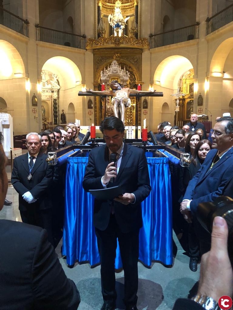 El alcalde de Alicante ha participado hoy en el Vía-Crucis organizado por la Junta Mayor de Hermandades y Cofradías de Semana Santa de Alicante, que preside Alfredo Llopis. La comitiva ha partido de la Concatedral de San Nicolás a donde ha regresado después de recorrer distintas calles del Casco Antiguo. Ha sido la imagen del Cristo de la Paz, perteneciente a la Cofradía de Nuestra Señora de la Piedad y Cristo de la Paz, que cumple 70 años desde su fundación, la que ha presidido el vía-crucis. Lo ha hecho en unas parihuelas.