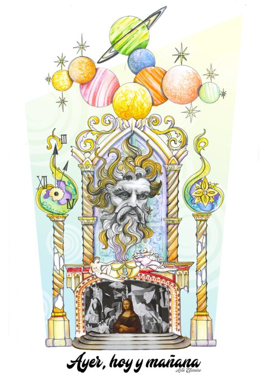 La obra, titulada “Ayer, hoy y mañana”, está siendo creada por el artista alicantino Fran Santonja Peni (Arte Efímero S.L.) y se alzará hasta los 20 metros de altura. Esta impresionante foguera invita a reflexionar sobre la evolución de la Humanidad, desde sus orígenes hasta los desafíos del presente y las incertidumbres del futuro. El proyecto cuenta con la dirección artística y los versos de Juan Carlos Vizcaíno, conocido festero de Villena e integrante de la comparsa Labradores.