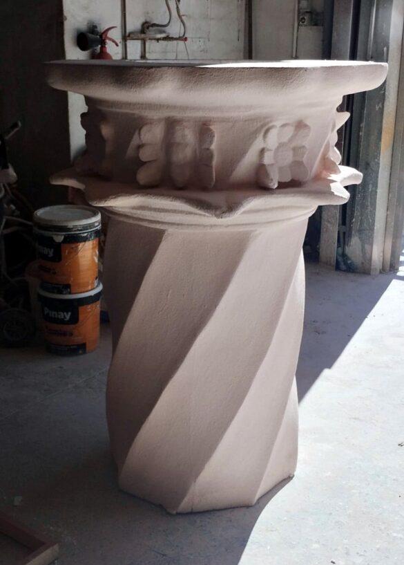 Uno de los elementos más destacados de la parte frontal de la hoguera –dedicada a la mirada hacia el pasado– será el homenaje visual a Villena. En la base de la estructura central se recreará el escenario del centenario Teatro Chapí, uno de los emblemas culturales de la ciudad. Además, el cuerpo principal de la foguera estará decorado con imponentes columnas helicoidales, que evocan el estilo arquitectónico de la Iglesia Arcedianal de Santiago, declarada monumento nacional.