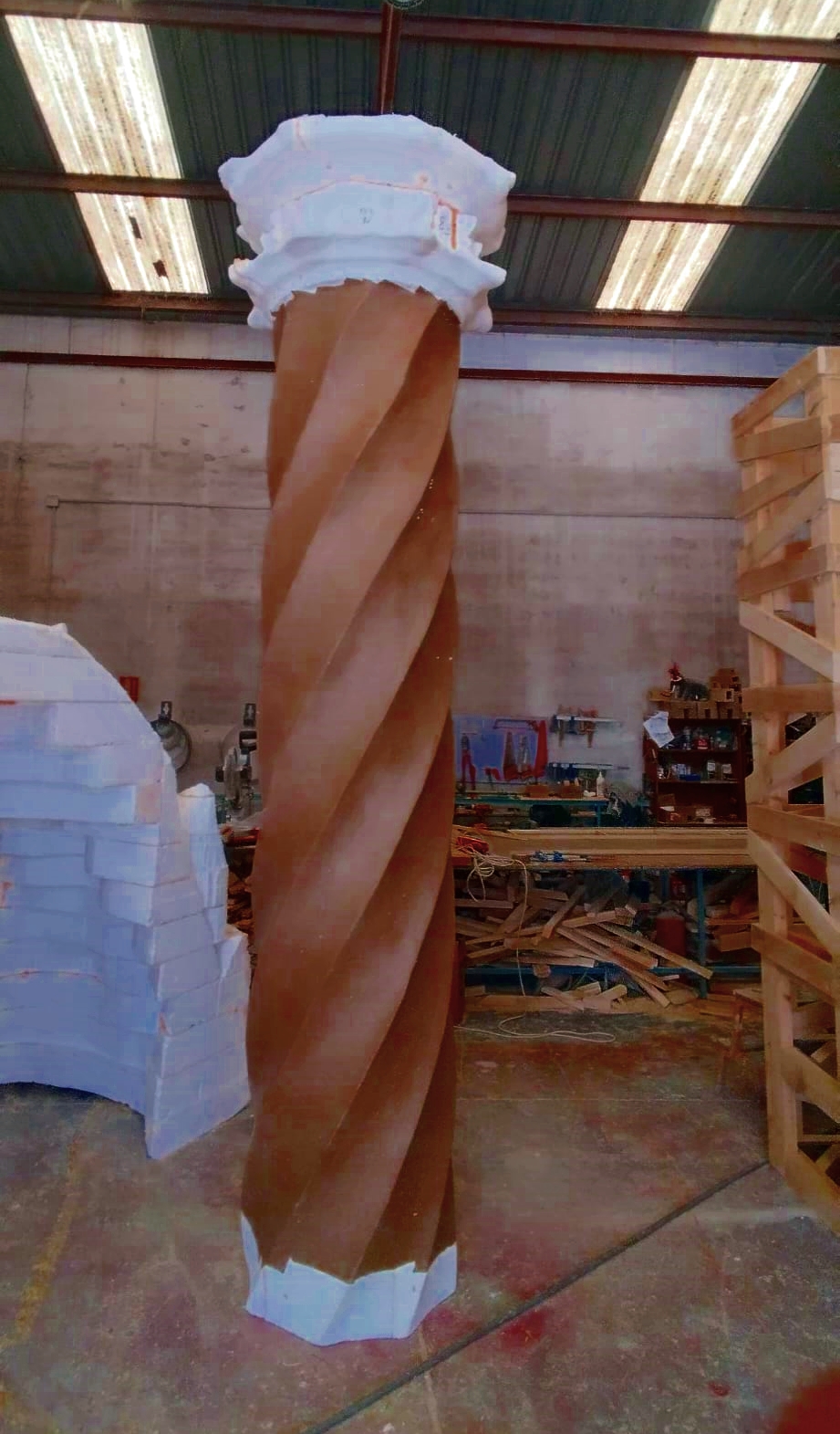 Uno de los elementos más destacados de la parte frontal de la hoguera –dedicada a la mirada hacia el pasado– será el homenaje visual a Villena. En la base de la estructura central se recreará el escenario del centenario Teatro Chapí, uno de los emblemas culturales de la ciudad. Además, el cuerpo principal de la foguera estará decorado con imponentes columnas helicoidales, que evocan el estilo arquitectónico de la Iglesia Arcedianal de Santiago, declarada monumento nacional.