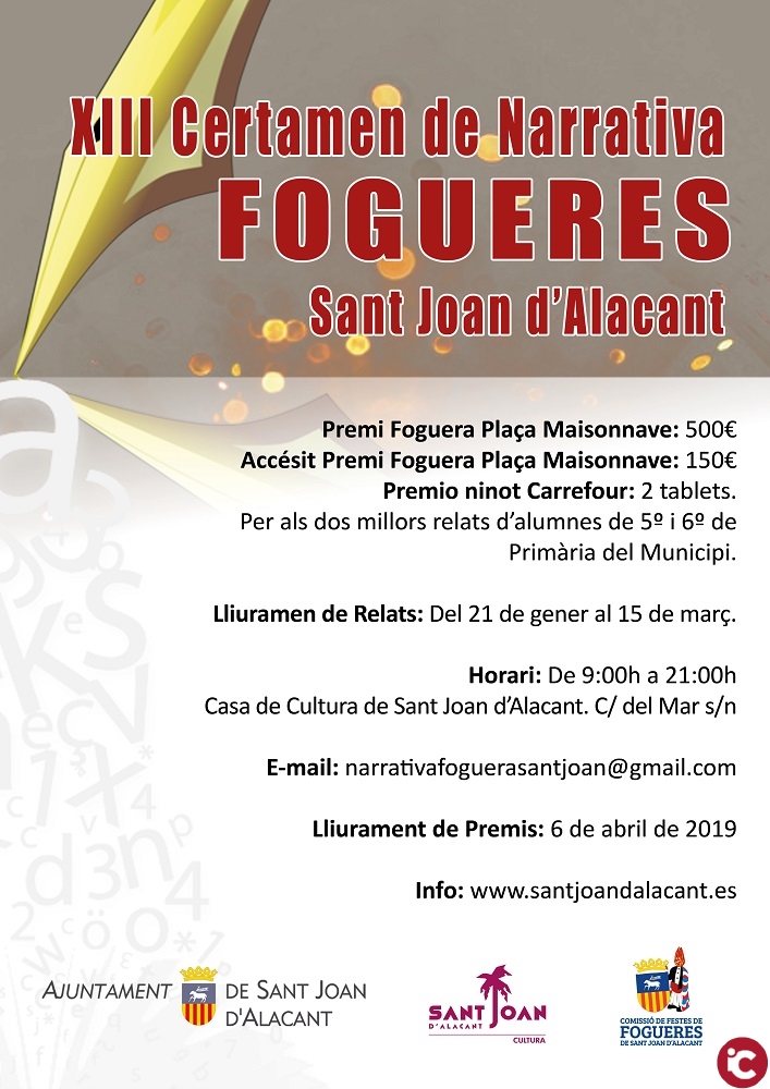 La Hoguera Plaza Maisonnave de Sant Joan d’Alacant y el Ayuntamiento de Sant Joan d’Alacant; convoca el XIII Certamen nacional de Narrativa con carácter nacional que se regirá por las siguientes bases: