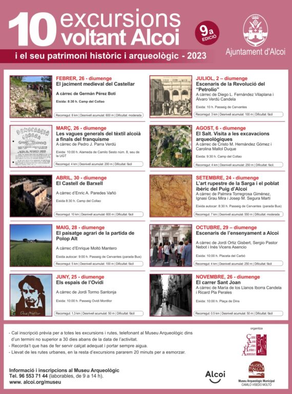 – Cal inscripció prèvia per a totes les excursions i rutes, telefonant al Museu Arqueològic dins d’un termini no superior a30 dies abans de la data de l’activitat.