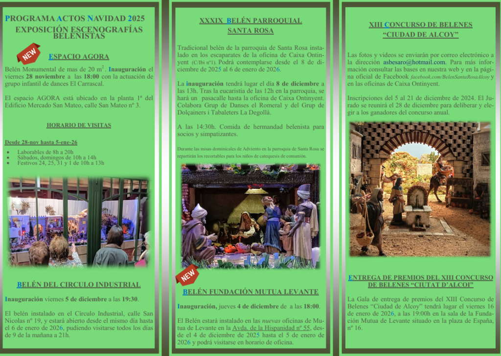 La Asociación Belenista Santa Rosa de Alcoy ha presentado el Programa de Actos de Navidad 2025, una propuesta cultural y tradicional que incluye la inauguración de cuatro belenes en distintos puntos de la ciudad, así como la celebración del XIII Concurso de Belenes “Ciudad de Alcoy” y otras actividades dirigidas a todos los públicos.