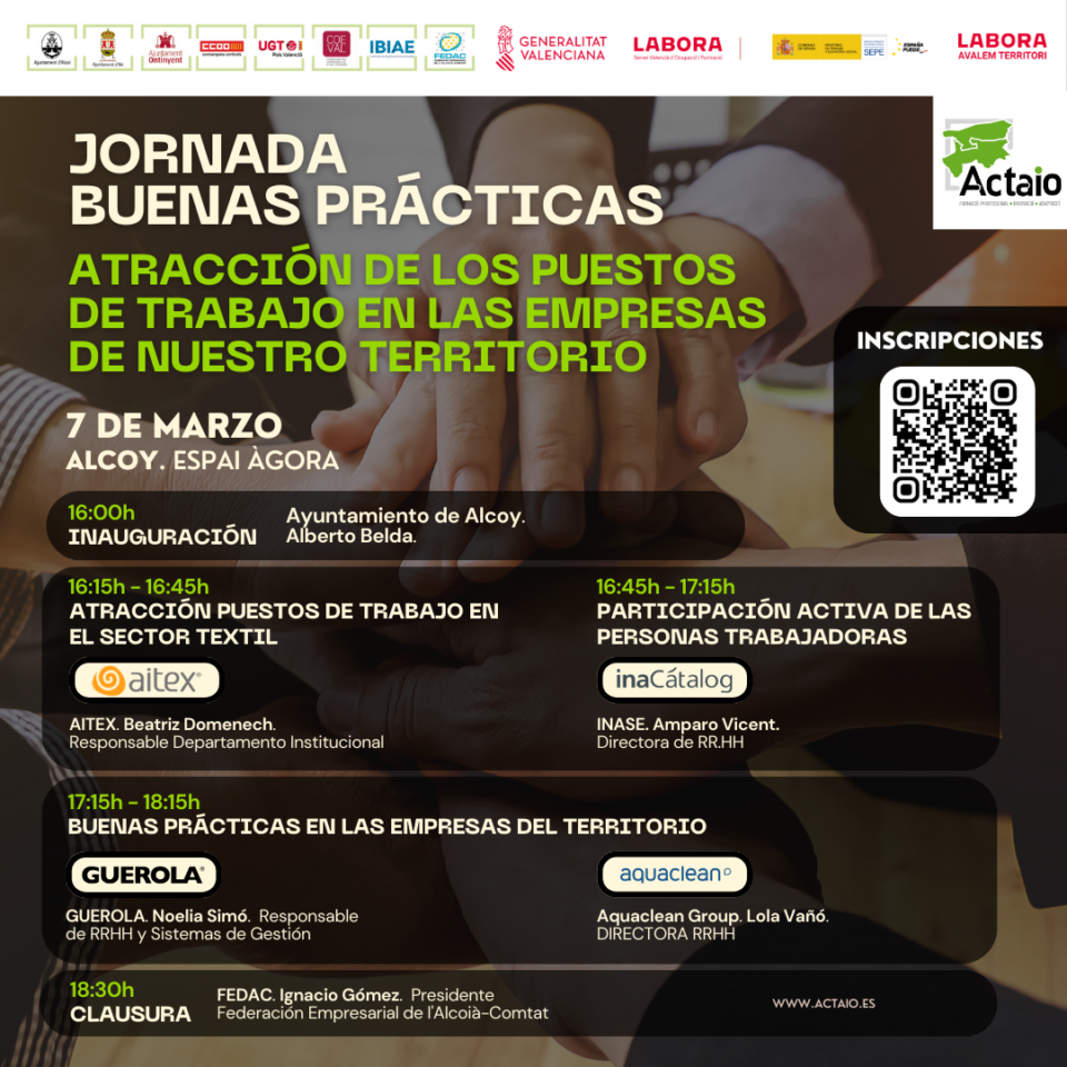 L’Acord Territorial per a l’ocupació i el desenvolupament local d’Alcoi-Ibi-Ontinyent (ACTAIO) ha organitzat una Jornada “Atracció dels Llocs de treball en les Empreses del nostre Territori”, que se celebrarà de manera presencial en el Espai Àgora (Plaça Ramón y Cajal, 6, 03801, Alcoi) el dimarts 7 de març des de les 16´00 h fins a les 18´30 h, amb l’objectiu de donar continuïtat a l’esdeveniment de la Setmana d’Estratègies d’Atracció de Talent de la passada edició.