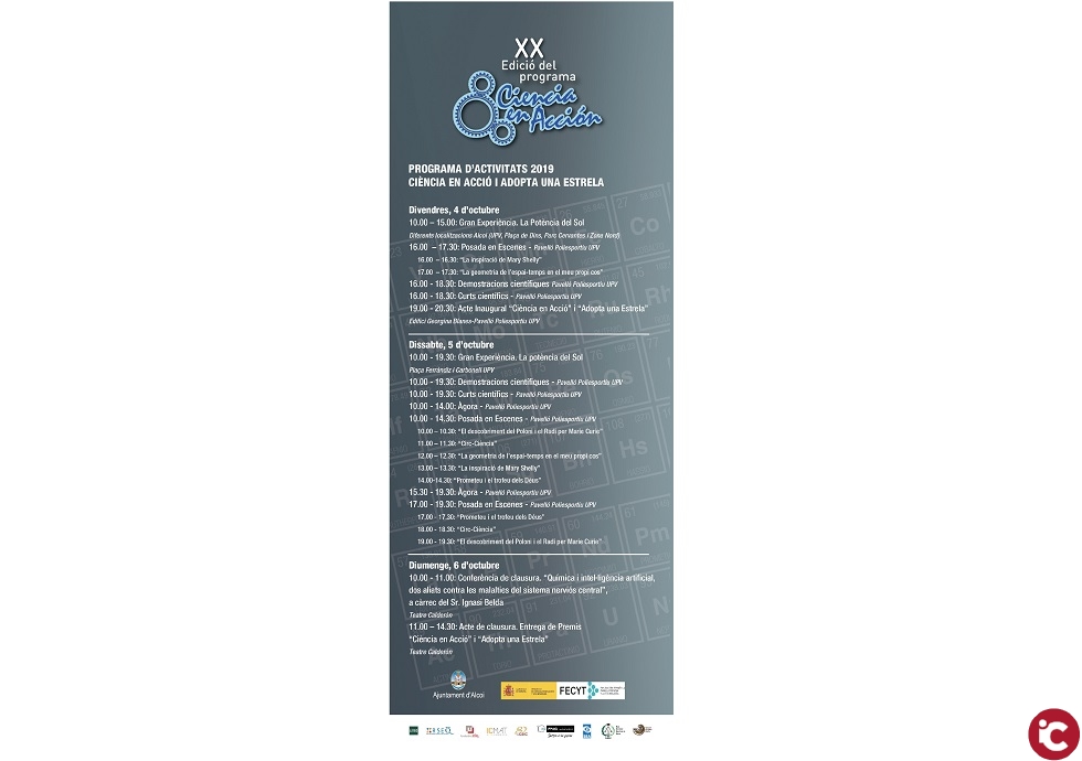 Alcoi acull, des del divendres 4 al diumenge 6 d’octubre, «Ciència en Acción» ,un programa internacional que compleix dues dècades apostant per la divulgació científica i per acostar als joves i al gran públic en general, la importància i la transcendència de la ciència d’una manera divertida. Per a aquesta gran festa científica s’acostaran fins a la nostra ciutat, científics, alumnes i docents de 10 països de tot el món, disposats a participar, aprendre i gaudir amb experiments i activitats úniques.