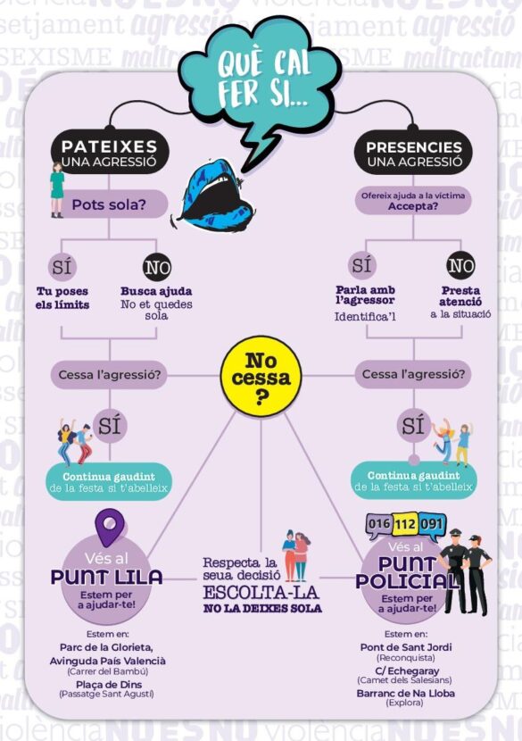 A més d’aquests punts ‘lila’, durant les Festes, la policia local disposarà dels següents punts de tall al trànsit rodat les 24 hores del dia, per la qual cosa els mateixos seran referents a l’hora de localitzar, focalitzar i coordinar les ajudes necessàries per a l’assistència a víctimes de qualsevol naturalesa i en particular, aquelles que referides a agressions sexuals. Estarà en el pont de Sant Jordi (Furgó policial) enfront de l’Hotel Reconquesta, pont Barranc Na Lloba, front museu Explora i en la intersecció entre els carrers Capellá Navarro i Echegaray (pati posterior del Col·legi Salesià Sant Vicent Ferrer)