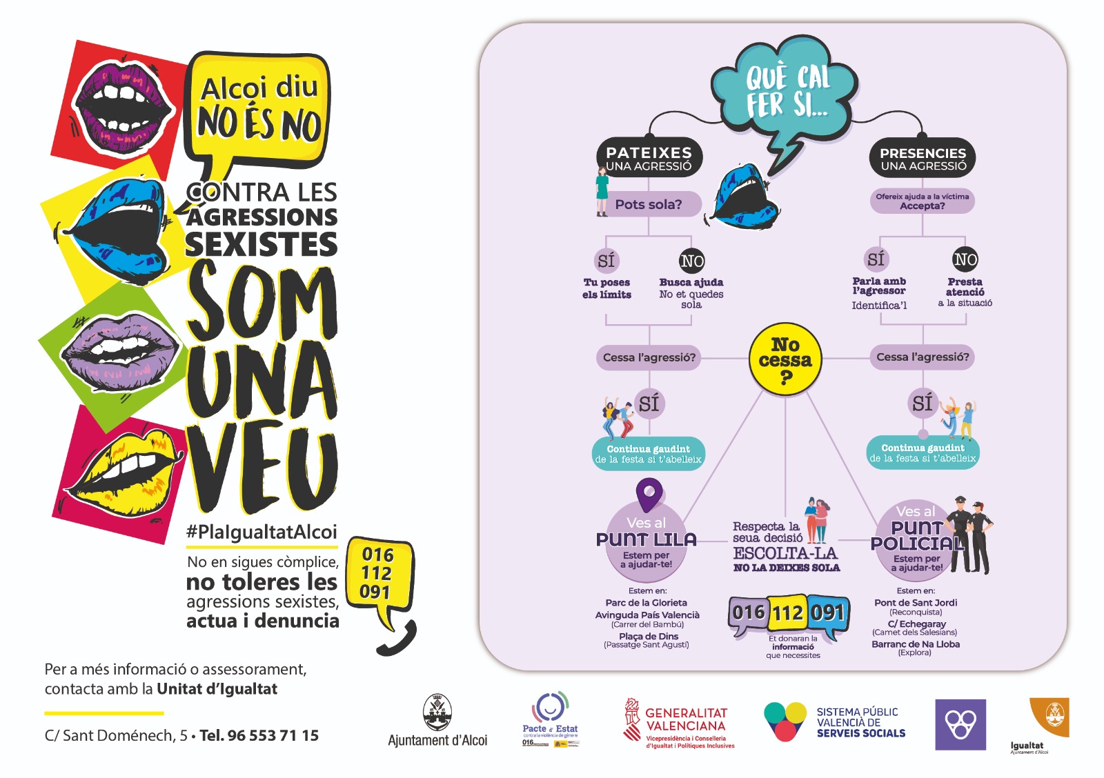 “Les Festes són perquè totes les persones s’ho passen bé i les puguen viure en llibertat sense que li ho impedisca la por. És primordial i necessari que la ciutadania i el conjunt d’agents socials, hostaleria, oci nocturn, filaes, transport públic, taxistes, s’unisquen en el rebuig a les agressions sexistes. Alcoi diu No és No. Contra les agressions sexistes, Som una veu”, destaca la regidora d’Igualtat, Aranza de Gracia.