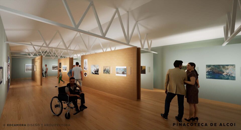 El disseny museogràfic de la Pinacoteca Municipal, elaborat per Ángel Luis Rocamora (Rocamora Diseño y Arquitectura S.L.P.), naix amb la voluntat de respectar escrupolosament l’arquitectura original de l’antic Asil de Sant Josep, integrant cada element expositiu en harmonia amb l’edifici i sense alterar-ne el caràcter històric. La proposta combina criteris de conservació preventiva, accessibilitat universal i una presentació atractiva capaç de connectar amb públics diversos.