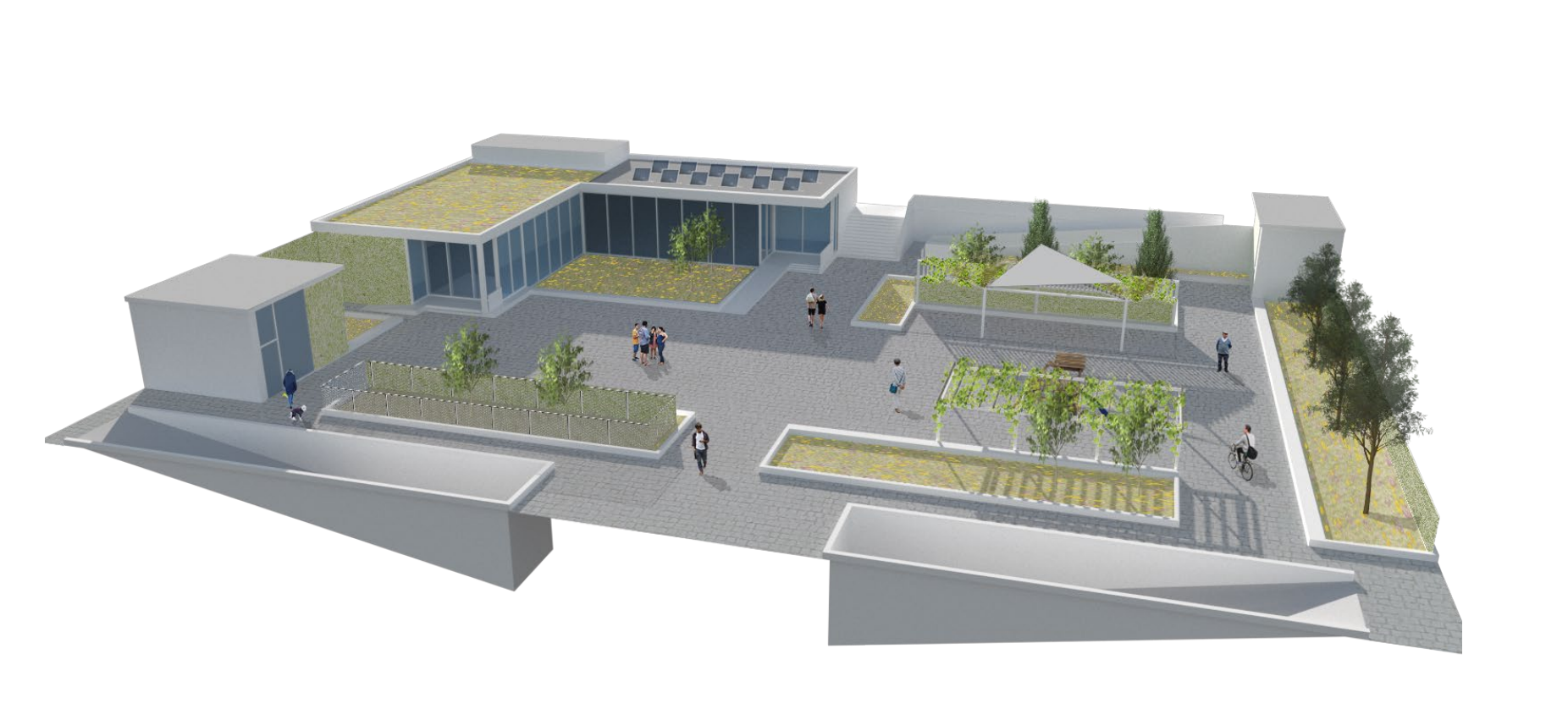 El projecte ha sigut redactat per la UTE formada per Enginyeria de l’Entorn Natural i Belda Enginyers, i proposa una intervenció integral en un espai urbà molt consolidat, actualment dominat per superfícies de formigó i mancat de vegetació. Les actuacions contemplen la revegetació de parterres, façanes i cobertes mitjançant solucions basades en la natura, amb espècies autòctones i de baix consum hídric, així com la millora de les zones d’estada i els espais infantils.