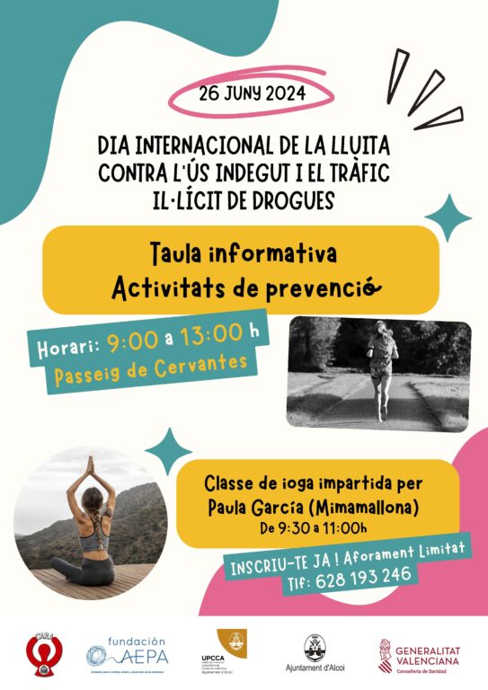 L’Ajuntament d’Alcoi, en concret, la Unitat de Prevenció Comunitària en Conductes Addictives (UPCCA) al costat de les entitats Fundació AEPA i G.A.R.A Alcoy, ha organitzat per a demà dia 26 de juny amb motiu de la celebració del Dia Internacional contra el Tràfic Il·lícit i Abús de Drogues.