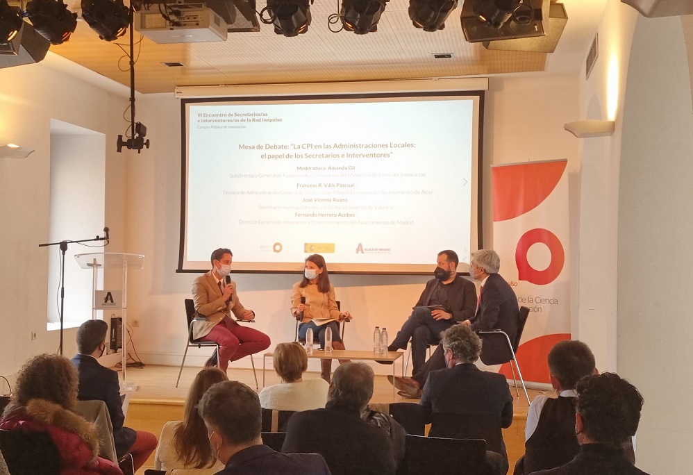 La regidora de Contractació, Lorena Zamorano, junt Francesc R. Valls Pascual, Tècnic d’Administració General de l’Oficina de Fons Europeus de l’Ajuntament d’Alcoi, han assistit a la jornada en la qual el citat T.A.G. ha participat com a ponent en la taula de debat titulada: «La CPI en les Administracions Locals: el paper dels secretaris i interventors», que va estar moderada per la subdirectora General. S. G. de Foment de la Innovació del Ministeri de Ciència i Innovació; Amanda Gil i en la qual també van intervenir el secretari municipal de l’Àrea Il de l’Ajuntament de València; José Vicente Ruano i el director general d’Innovació i Emprenedoria de l’Ajuntament de Madrid; Fernando Herrero Acebes.