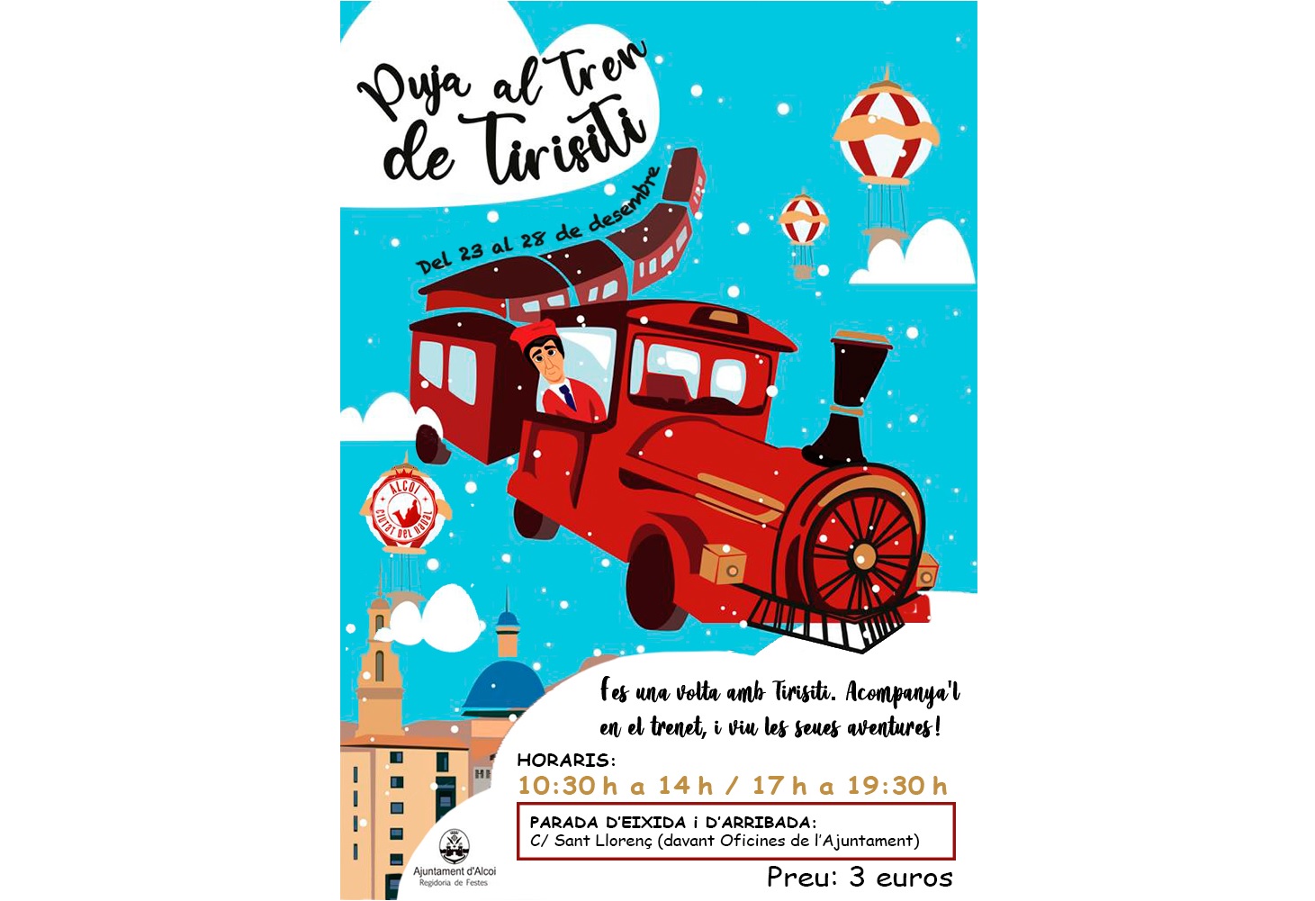 Del 23 al 28 de desembre un trenet decorat amb elements de Tirisiti recorrerà distints punts de la nostra ciutat. El tren eixirà des del carrer Sant Llorenç, 2 i anirà per l’Avinguda País Valencià, pont de María Cristina, carrer Els Alçamora, pont de Sant Roc, Alameda Camilo Sesto, Pont de Sant Jordi, Sant Tomàs i per la plaça d’Espanya tornarà a Sant Llorenç.