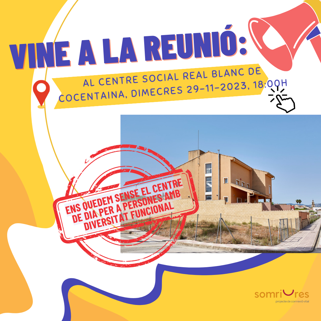 Així doncs, convidem a tota persona que se senta afectada a que vinga demà a la reunió a defensar els drets i la dignitat dels seus familiars. Els polítics que ens representen han de saber que no poden jugar així, tan fàcilment amb nosaltres. Perquè havíem confiat en ells, en les tres administracions públiques i ara, després de tants esforços, temps i diners invertits, no ens poden dir que el centre serà per a un altre fi.