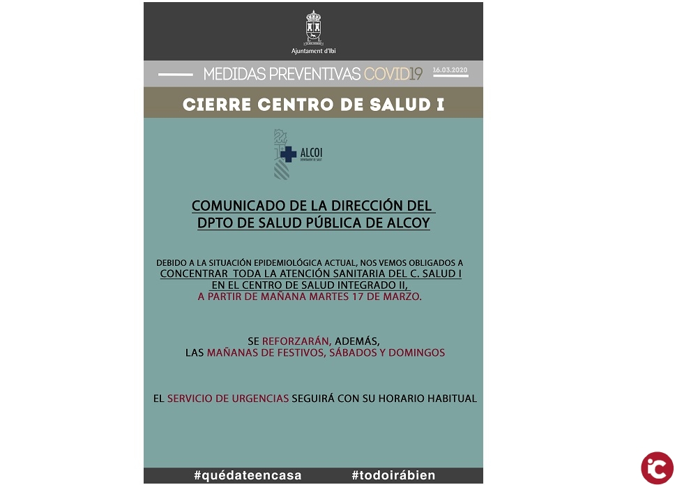 La Dirección del Departamento de Atención Primaria de Salud Pública de Alcoy informa que, debido a la situación epidemiológica actual, se ven obligados a concentrar toda la atención sanitaria de la zona básica del Centro de Salud I en el Centro de Salud Integrado II de Ibi, a partir de mañana martes 17 de marzo.