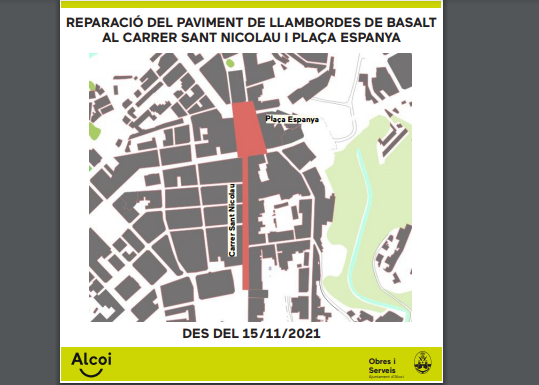 El pròxim dimarts 15 està previst que comencen les obres de reparació del paviment de Sant Nicolau i plaça d’Espanya. L’actuació consistirà en la demolició de les zones de la calçada amb llambordes de basalt on hi ha enfonsaments, per a sanejar la base del ferm així com la posterior reposició de les llambordes.