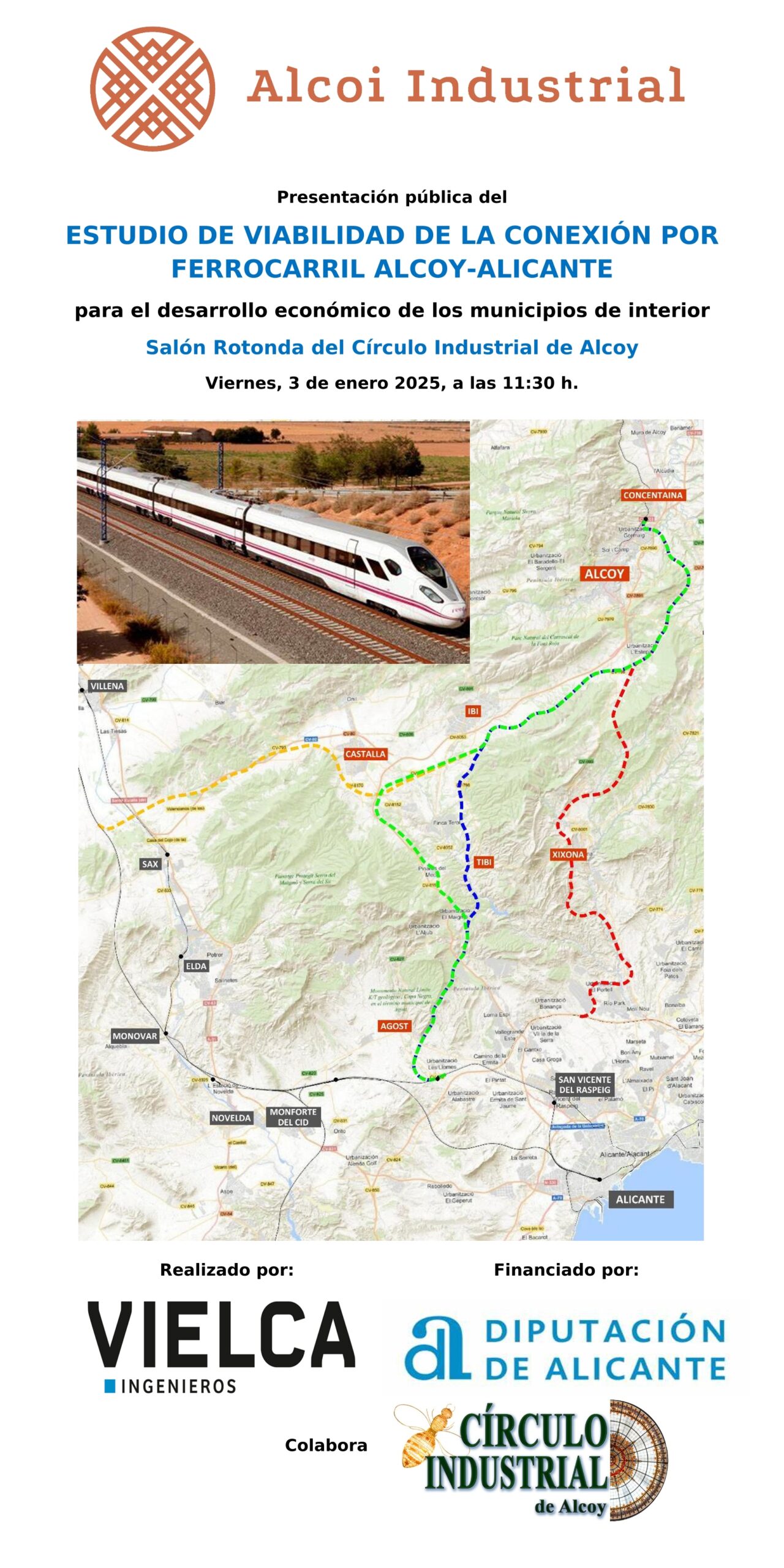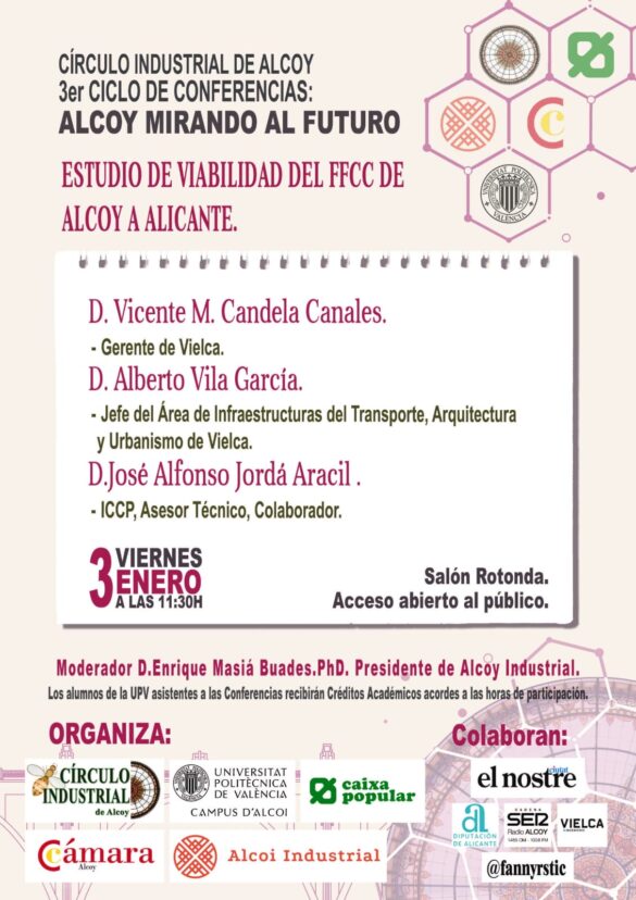 El próximo viernes, 3 de enero de 2025, el Círculo Industrial de Alcoy será el escenario de la presentación del Estudio de Viabilidad Técnica para la conexión ferroviaria entre Alcoy y Alicante, un proyecto de gran relevancia para el futuro de la región. La cita, programada para las 11:30 h en el Salón Rotonda, contará con la presencia de importantes autoridades locales, autonómicas y empresariales, así como de los ingenieros responsables del estudio.