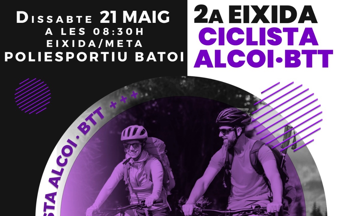 Aquest dissabte 21 de maig tindrà lloc la II Eixida Ciclista Alcoi-BTT coorganitzada per 226ERS Endurance School i l’Ajuntament d’Alcoi, així com de la Unió Ciclista Alcoi. Es tracta d’una eixida recreativa no competitiva amb dos itineraris diferents, amb eixida i meta en el Poliesportiu de Batoi, el primer de 31 km és la Ruta Homologada BTT i el segon anar a la Sarga i tornar per la via verda d’uns 20 km aproximadament.