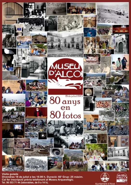 Amb la celebració d’aquesta efemèride, el proper divendres 18 de juliol a les 10.00 h el Museu convida a la ciutadania a una visita guiada excepcional, en la qual es podrà veure un audiovisual que fa un recorregut pels primers 80 anys, i a més poder visitar les dependències no obertes al públic, així com l’exposició temporal que s’acaba d’inaugurar “Alcoi en l’origen del Bronze Valencià. 100 anys d’arqueologia”.