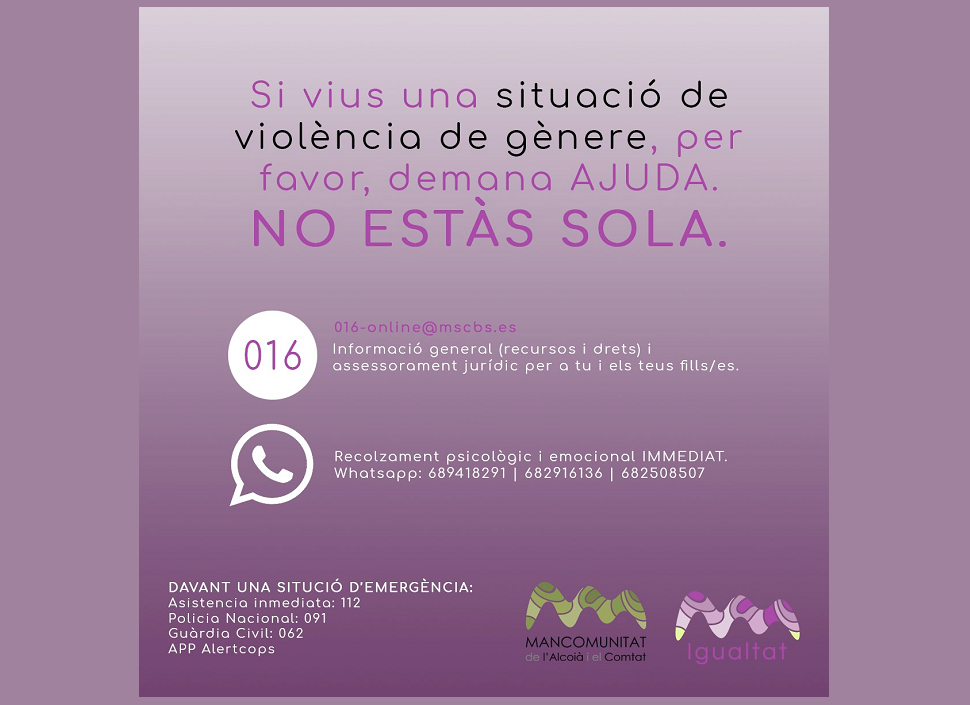 La Mancomunitat de l’Alcoià i el Comtat ha adaptat tots els seus serveis a la situació derivada de la crisi sanitària per la COVID-19, entre els quals es troben els serveis d’Igualtat i de la Unitat de Prevenció Comunitària de Conductes Addictives. Ambdós serveis són d’especial importància en aquestos moments, ja que moltes persones en situació de rehabilitació per addiccions o dones en situació de risc de patir violència masclista poden trobar-se en una situació de vulnerabilitat amb el confinament. Amb el lema ‘No estàs sol. No estàs sola’, es vol recordar a la població que pot comptar amb aquestos serveis i disposar de l’ajuda necessària.