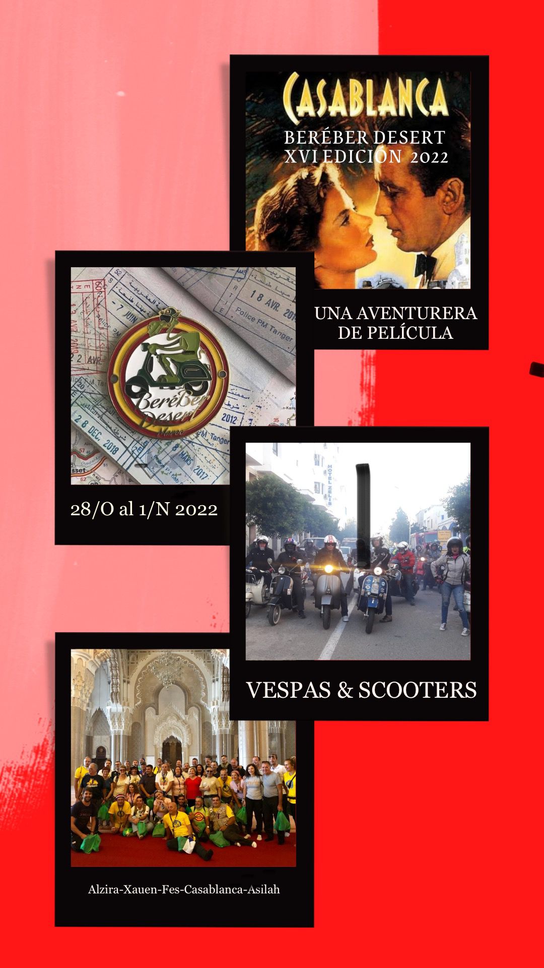 Adjuntamos algunas fotografías ilustrativas. Podrán seguirlos en directo a través de las redes sociales de «turismo en Vespa» y además el domingo 30 de octubre se emitirá un programa en directo desde Casablanca a través del canal Youtube.com/turismoenvespa