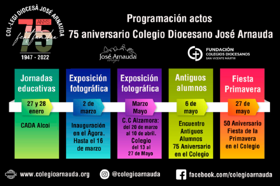 Inmersos ya en nuestro 75 aniversario, compartimos con vosotras la programación de actividades que se realizarán durante el curso. En un año tan especial, os invitamos a participar de todas ellas y os iremos informando sobre cómo poder hacerlo en cada una. Entre todos hemos construido la historia de nuestro colegio y contamos con todos vosotros para seguir haciendo historia. Por 75 años más haciendo familia.