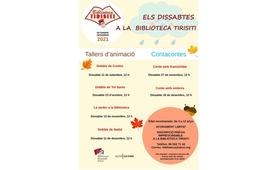 La Biblioteca Infantil Tirisiti ha presentat la seua programació per als darrers mesos de l’any. Es durà a terme diferents dissabtes a les 12 hores, activitats recomanades per a xiquets i xiquetes de 4 a 12 anys, havent d’estar acompanyats per una persona adulta els menors de sis anys. És imprescindible la inscripció prèvia que es pot fer de dues maneres, per telèfon en el 96 553 71 43 i per correu electrònic, biblioteca@alcoi.org. Pel que respecta a la programació hi haurà 4 tallers d’animació i 2 contacontes.